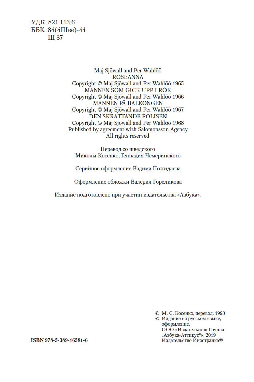 | Название в оригинале | Roseanna. Mannen som gick upp i rök. Mannen på balkongen. Den Skrattande Polisen |