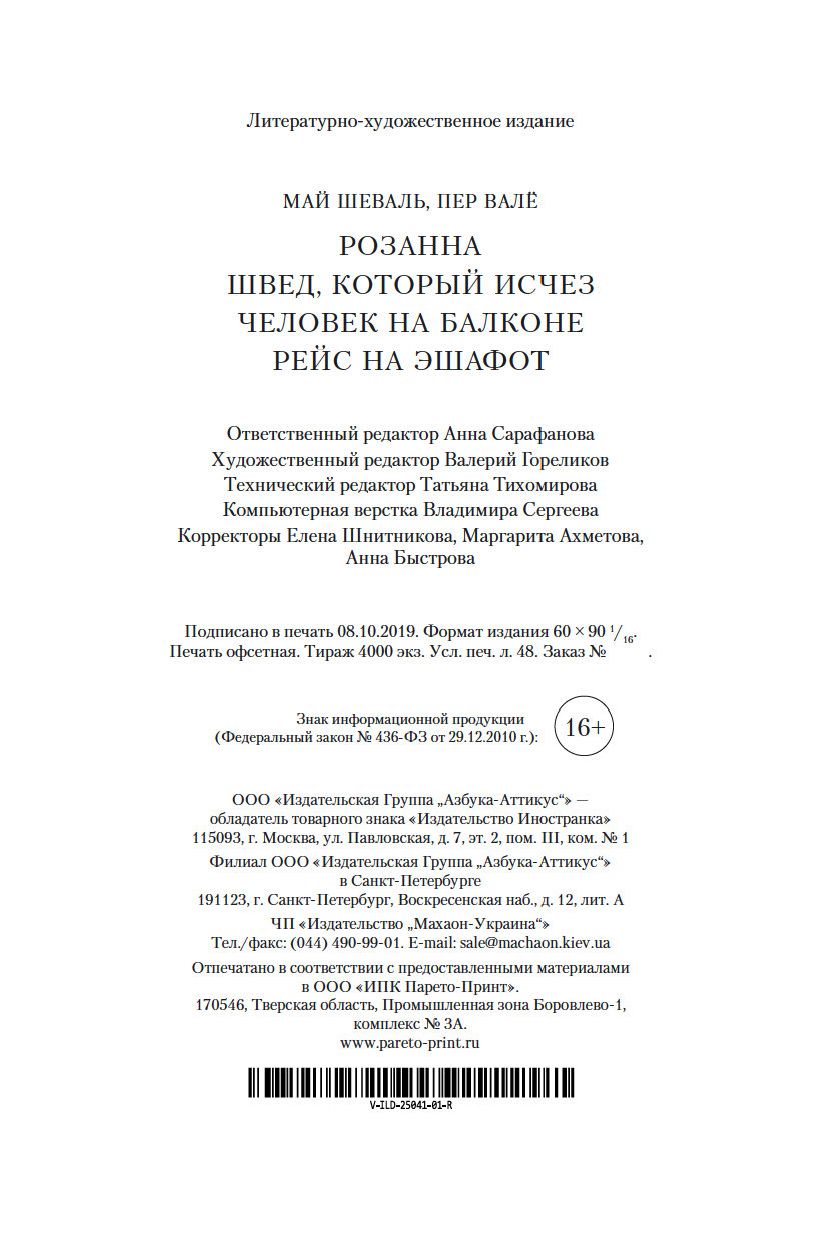 В настоящую книгу вошли первые четыре романа декалогии: "Розанна" (1965), "Швед, который исчез" (1966), "Человек на балконе" (1967) и "Рейс на эшафот" (1968).