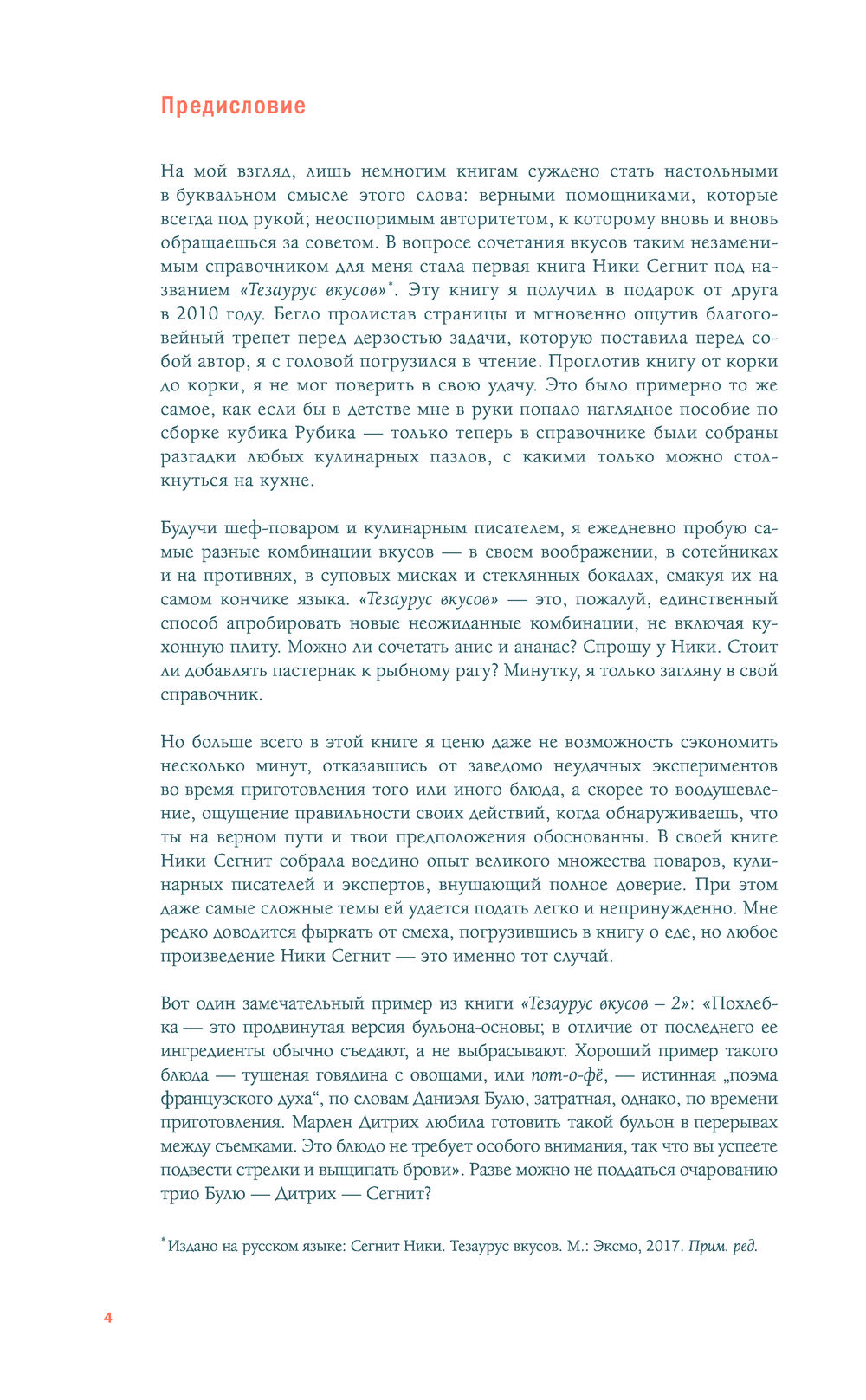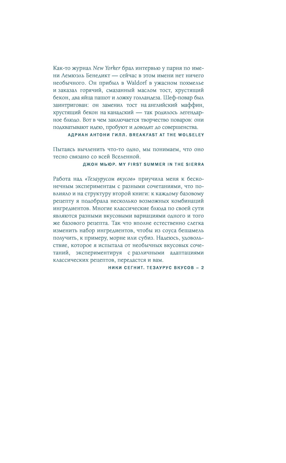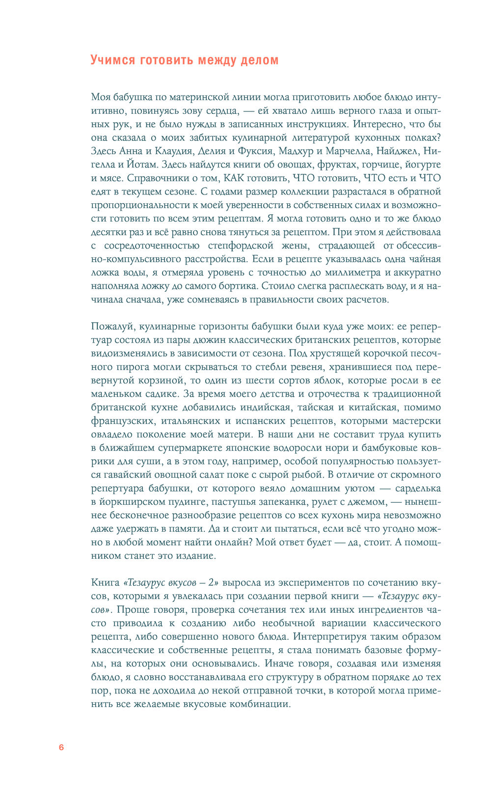 В мою задачу входила лишь подготовка набора простых действий, следуя которым, вы сможете понять суть блюда и адаптировать его под себя. Каждый рецепт был неоднократно испытан на практике. Но в первую очередь книга "Тезаурус вкусов 2" направлена на пробуждение желания поэкспериментировать – а эксперименты, надо признать, не всегда бывают удачными. Готовность ошибаться – главная предпосылка к тому, чтобы стать свободным и интуитивным кулинаром, на что, я надеюсь, и будет вдохновлять моя книга.