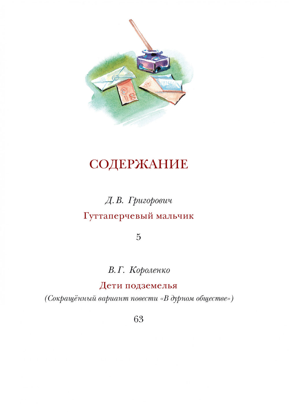 В книгу вошли повести двух классиков отечественной литературы: "Гуттаперчевый мальчик" Д. В. Григоровича и "Дети подземелья" В. Г. Короленко. Их объединяет общая тема – трагическая судьба сирот, которые пытаются выжить в мире жестокости и равнодушия. Книга пробуждает в читателях чувство милосердия и сострадания, учит ценить любовь, дружбу, отзывчивость.