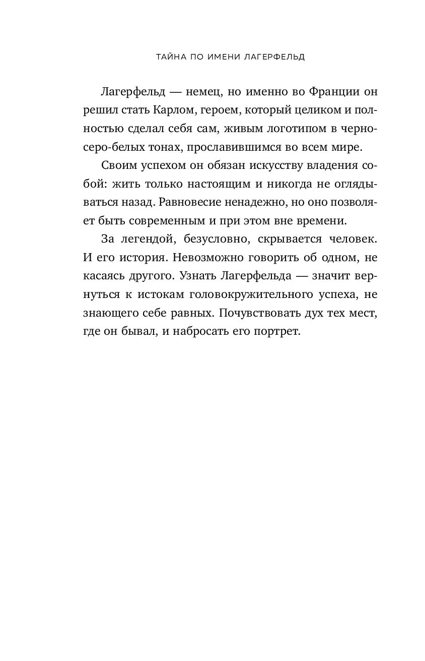 Неприступный и загадочный настолько, что до последнего времени даже год его рождения вызывал споры. Лагерфельд, окружил свою жизнь легендами и если выдавал информацию о себе, то осколками. Фотосъемки, коллекции для Chanel, любимая кошка Шупетт, немного афоризмов – вот темы выходивших до этого книг.