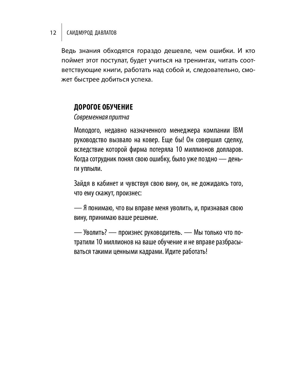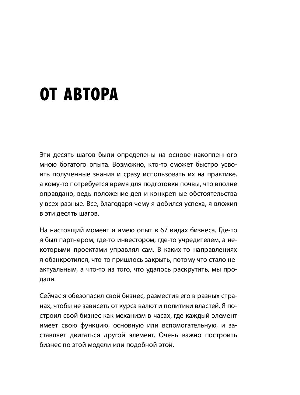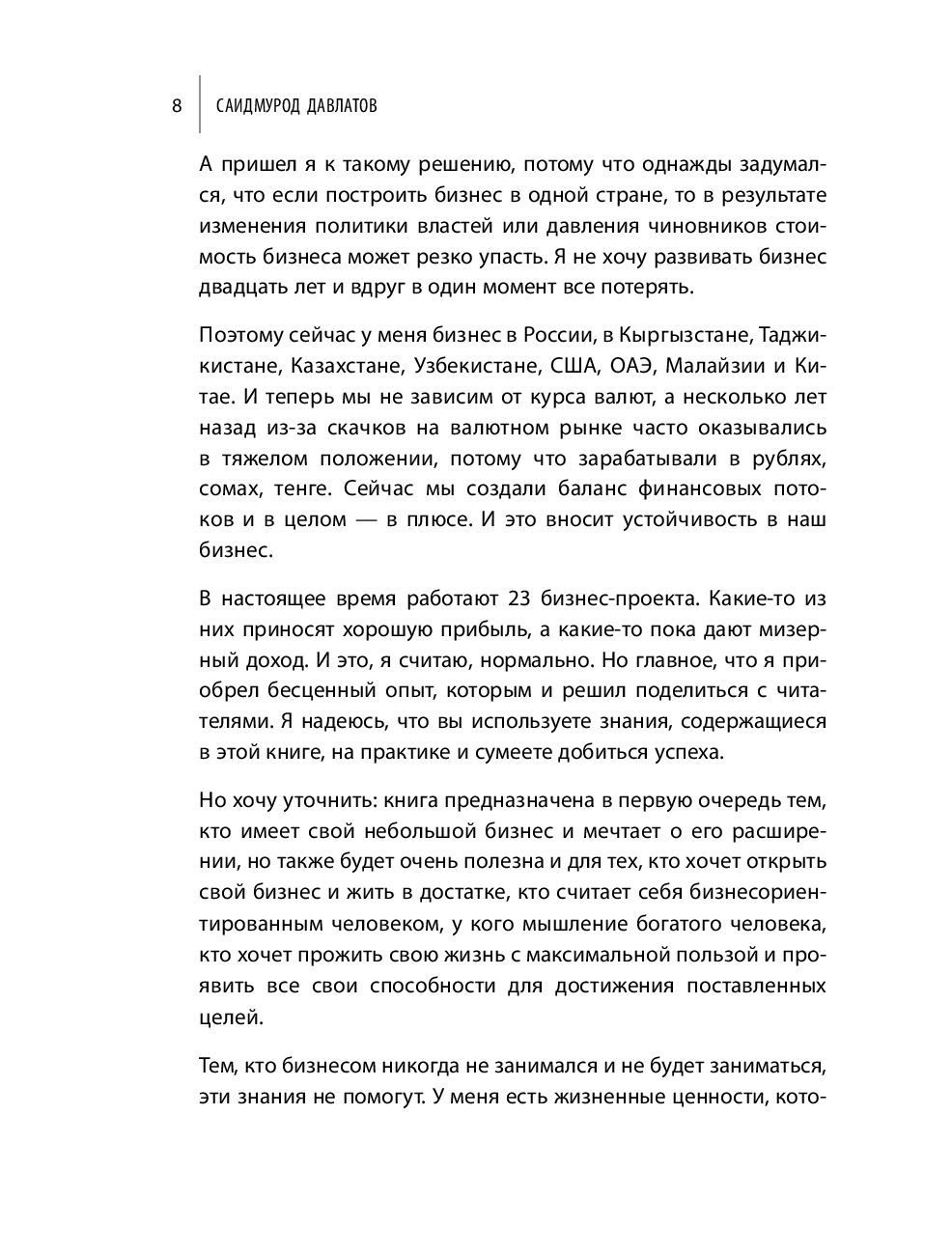 Всего 10 шагов отделяют вас от богатой, изобильной жизни! В этой книге Саидмурод Давлатов представляет пошаговую методику открытия и развития успешного бизнеса. Все его слова подкреплены делом, а советы – проверены реальным опытом. За свою жизнь автор участвовал в 67 бизнесах, и многие из них сейчас процветают. Но часть не оправдала себя, о чем честно рассказывает Саидмурод Давлатов. Именно благодаря тому, что речь идет как о позитивном, так и негативном опыте, книга так ценна – ведь лучше учиться на чужих ошибках, чем совершать собственные.