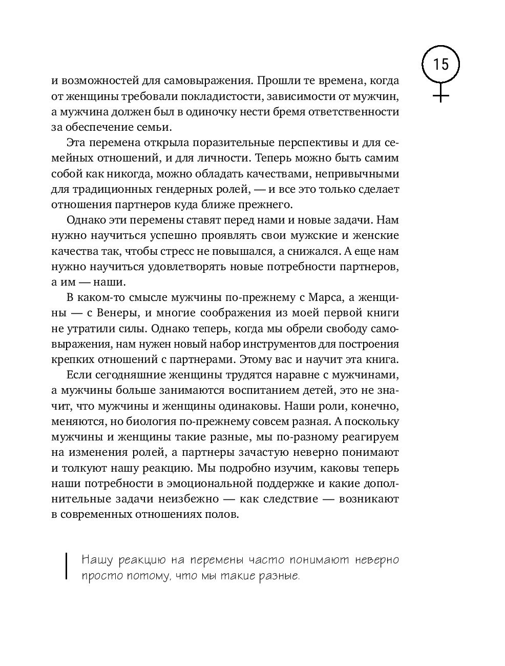 Изучая книгу, сотни тысяч мужчин и женщин по всему миру учились понимать друг друга, становились счастливыми, спасали отношения. Но в XXI веке некоторые советы стали уже не актуальны: мир – изменился! То, что было спасением в прошлом веке, сегодня перестало работать. Но все эти годы Джон Грэй продолжал работу с парами, консультировал, внимательно изучал тенденции нового мира. Поэтому появилась принципиально новая версия знаменитой книги, которая объединяет в себе открытия первой книги и новый современный взгляд на отношения.