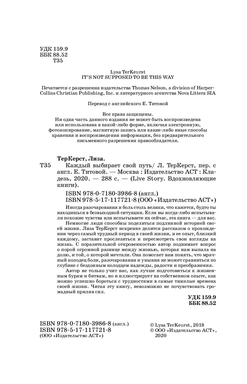 Немногие люди способны поделиться подлинной историей своей жизни. Лиза ТерКерст искренне делится рассказом о прохождении через самый трудный период в своей жизни, и ее опыт, близкий каждому, заставит прослезиться и пересмотреть свои взгляды на жизнь.