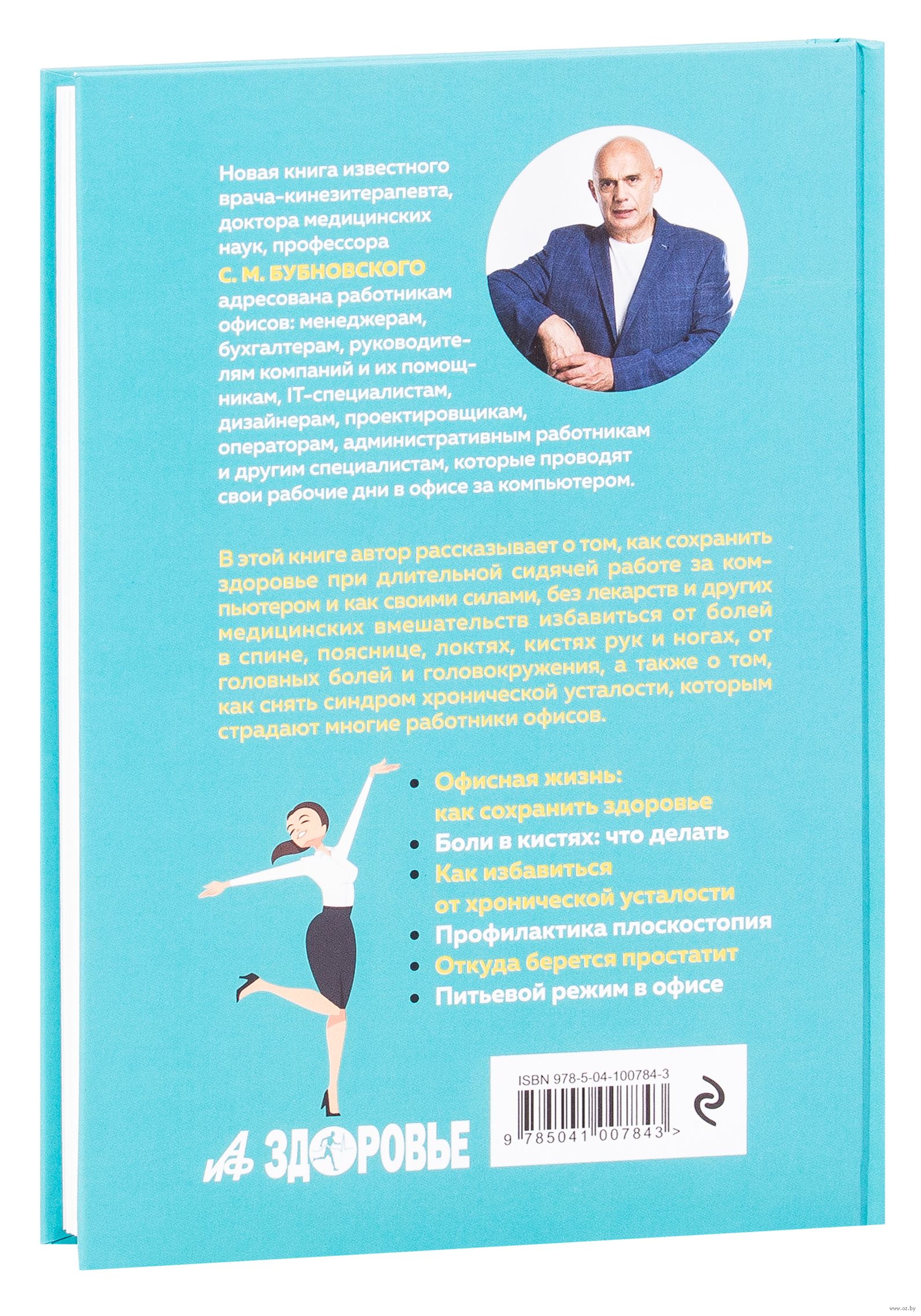 Новая книга известного врача-кинезитерапевта, доктора медицинских наук, профессора С. М. Бубновского адресована работникам офисов: менеджерам, бухгалтерам, руководителям компаний и их помощникам, IT- специалистам, дизайнерам, проектировщикам, операторам, административным работникам и другим специалистам, которые проводят свои рабочие дни в офисе за компьютером.