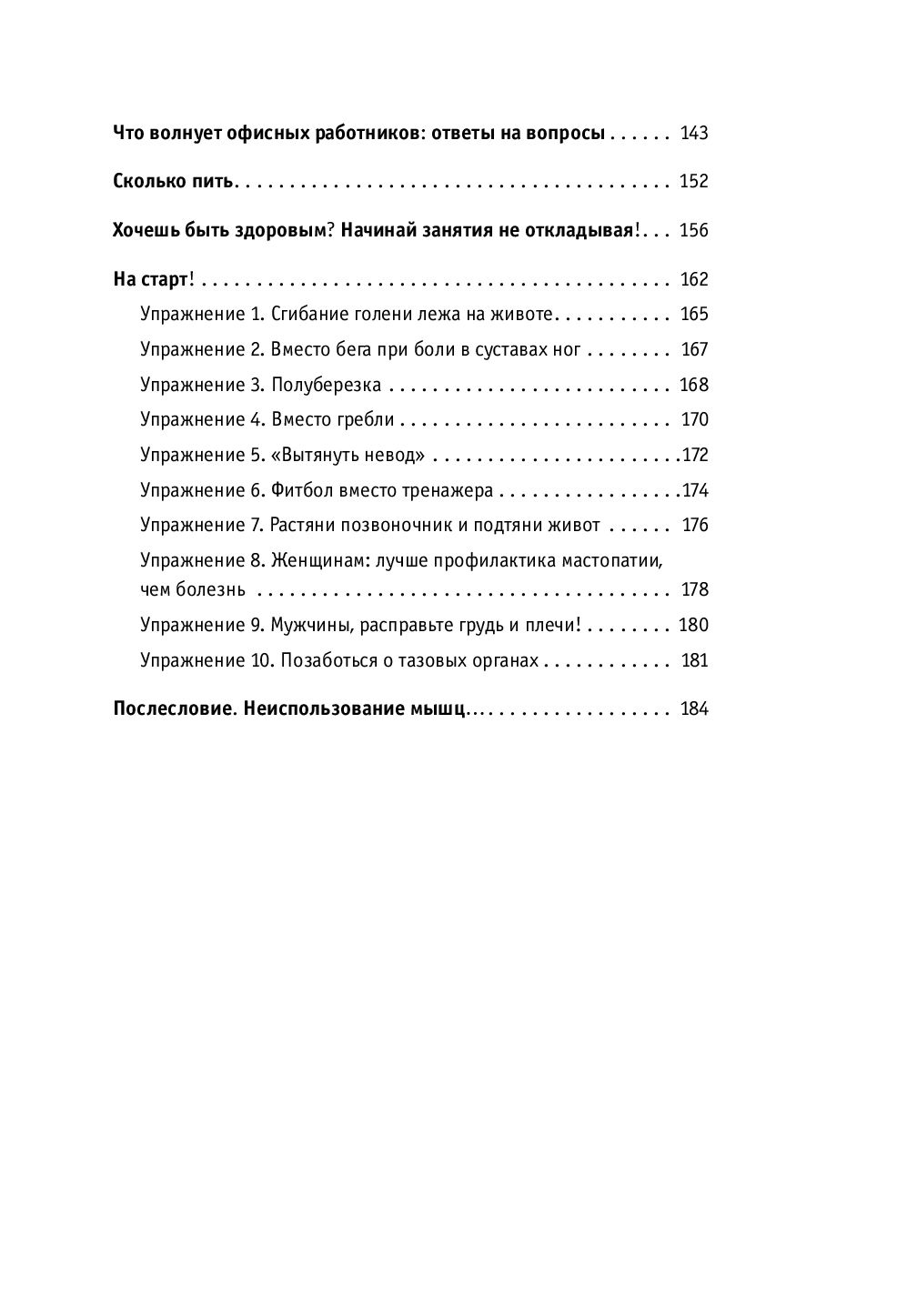В этой книге автор рассказывает о том, как сохранить здоровье при длительной сидячей работе за компьютером и как можно своими силами, без лекарств и других медицинских вмешательств избавиться от болей в спине, пояснице, локтях, кистях рук и ногах, от головных болей и головокружения, а также о том, как снять синдром хронической усталости, которым страдают многие работники офисов.