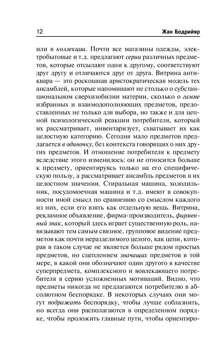 Работа Жана Бодрийяра, вышедшая в 1970 году, в буквальном смысле взорвала мироощущение молодых интеллектуалов всего мира. Абсолютную справедливость этой книги ежедневно доказывает в наше время сама жизнь современных цивилизованных стран – с ее дауншифтингом и "осознанным потреблением", неприятием "культа роскоши", возвращением к нематериальным ценностям, расцветом феминизма и даже медленной смертью "индустрии высокой моды" и "индустрии красоты".