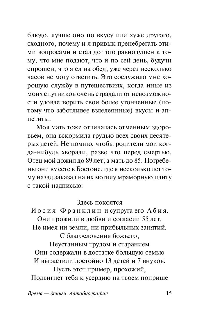Время - деньги. Бенджамин Франклин. Прочитав незаконченную автобиографию такого великого человека, как Бенджамин Франклин, можно для себя вынести массу полезного. Читаешь книгу и удивляешься от того, что она написана 3 века назад, в наше время найти столь полезную книгу остаётся сложной задачей. В книге автор описывает весь свой жизненный путь, свое становление как политического деятеля, дипломата, учёного пользующегося уважением как у народа, так и у выдающихся личностей того времени. Огромное внимание уделяется построению отношений между людьми, способам достижения поставленных целей, поиску своего места в жизни. Для себя можно вынести некоторые правила и привычки Б.Ф., хоть они помогли ему достичь желаемого лет 250-300 назад, и многие скажут, что ценности и установки на сегодняшний день уже совсем другие, но люди не меняются, а это значит, как минимум, что будет очень полезно узнать как автор устанавливал контакт и налаживал отношения с окружающими его людьми и при этом высоко ценился и был уважаем в обществе. Автор пишет о простых основах и давно забытых истинах, которые в современной литературе вряд-ли где-то увидишь. Эта книга оказалась для меня сокровищницей, из которой можно черпать и осваивать навык за навыком. Читать её или нет - дело ваше, но если ваш ответ положительный, могу пообещать, она вас не разочарует. При прочтении, настоятельно рекомендую делать заметки и выделять, что посчитаете нужным, не поленитесь и после прочтения сделать конспект и сгрупировать, выделенное. Мне очень интересно, какие мысли и эмоции вызвала эта книга у других её читателей, буду рад увидеть чьи-либо выводы и отзывы о ней. Приятного чтения.