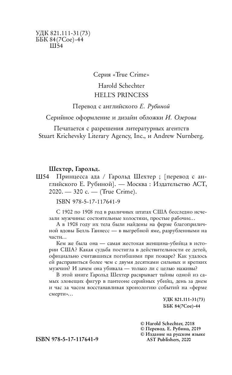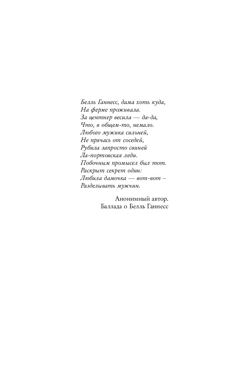 С 1902 по 1908 год в различных штатах США бесследно исчезали мужчины: состоятельные холостяки, простые рабочие... А в 1908 году их тела были найдены на ферме благоприличной вдовы Белль Ганнесс – в выгребной яме, разрубленными на части... Кем же была она – самая жестокая женщина-убийца в истории США? Какая судьба постигла в действительности ее детей, официально считавшихся погибшими при пожаре? Как удалось ей расправиться более чем с двумя десятками сильных и крепких мужчин? И зачем она убивала – только ли с целью наживы?