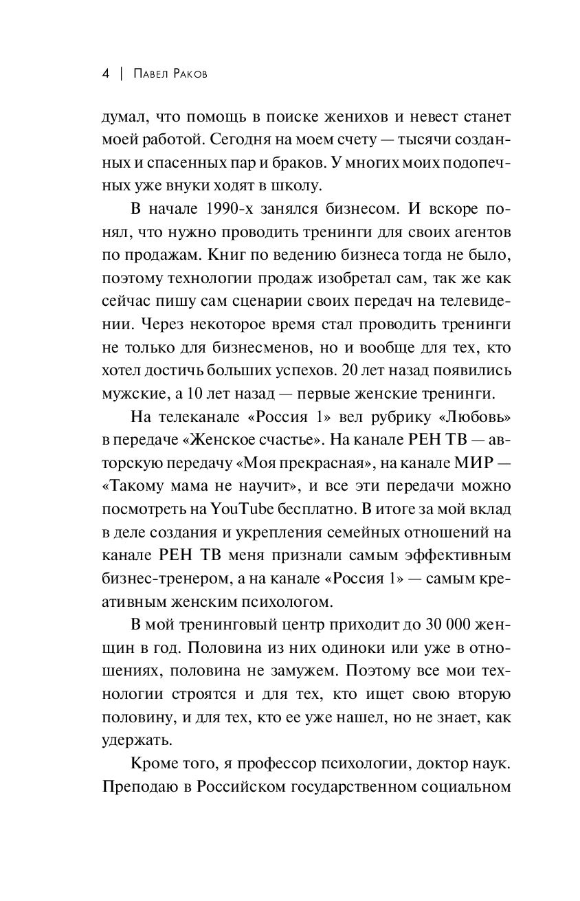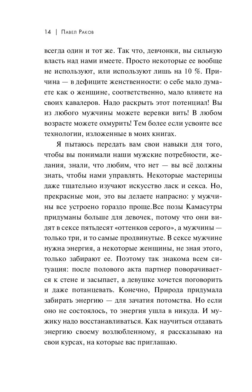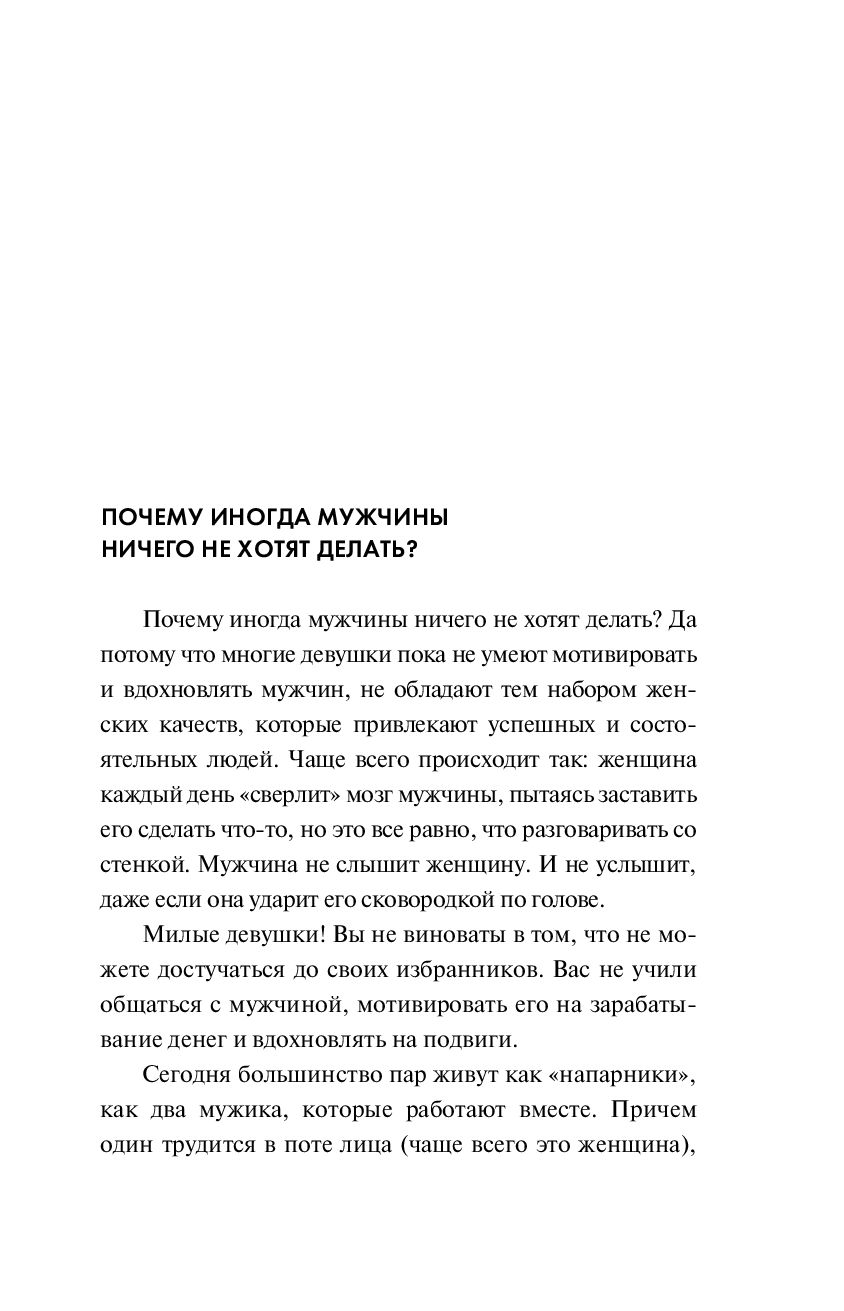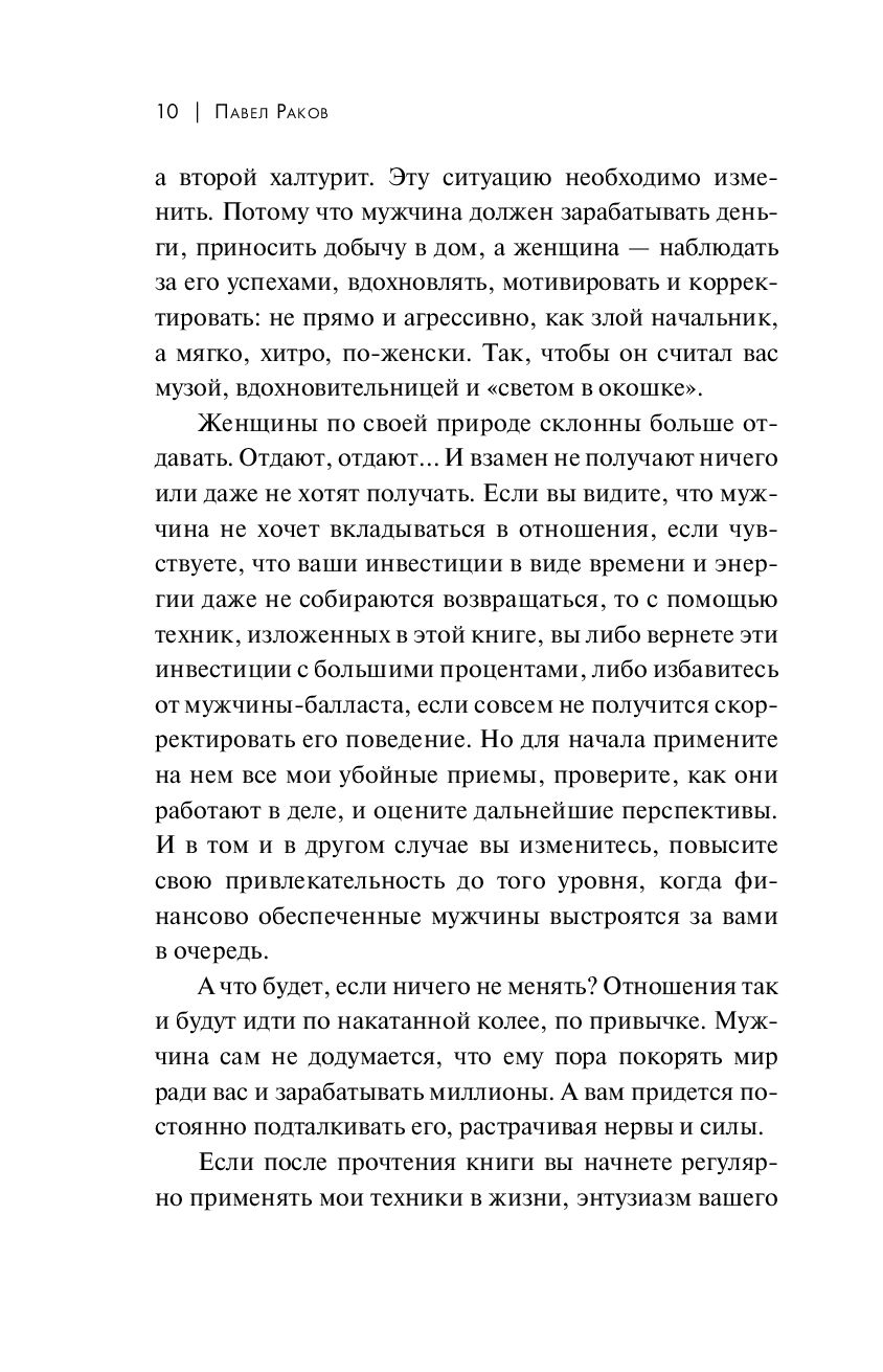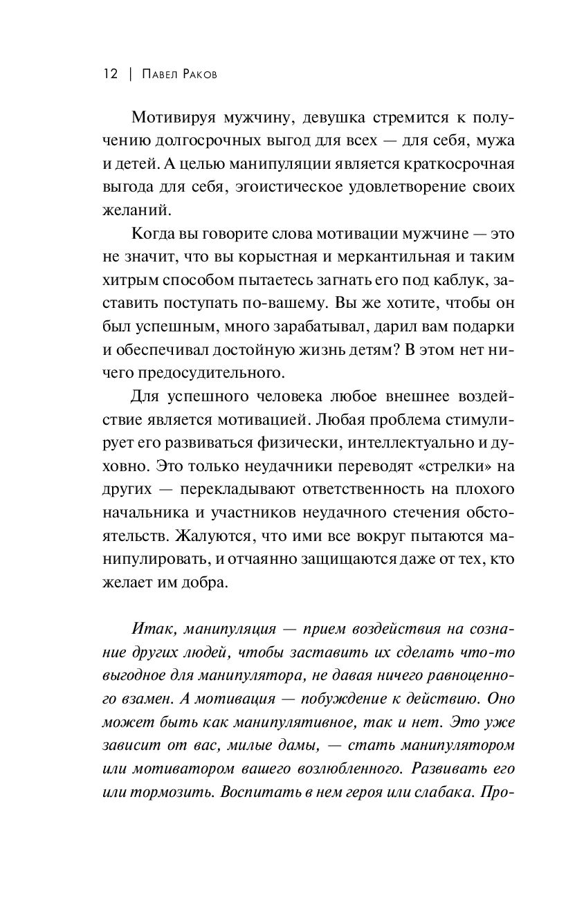Почему иногда мужчины ничего не хотят делать? Потому что вы, милые дамы, не умеете мотивировать и вдохновлять мужчин, не обладаете тем набором женских качеств, которые привлекают успешных и состоятельных людей. Автор – известный психолог, писатель, коуч-консультант Павел Раков – предлагает вам убойные приемы, которые заставят кавалера исполнять любые ваши желания. Он научит вас управлять мужчиной – незаметно, но действенно. А для этого поделится секретами "устройства" мужчины, подскажет, как и когда вдохновить его на брак, прибегая к специальным методам мотивации и манипуляции. Укажет на грубые ошибки, которые совершают незамужние девушки и жены, пытаясь верховодить. Научит интриговать, проявлять инициативу, делать правильные комплименты своим партнерам и зажигать у мужчин желание осыпать вас бриллиантами!
