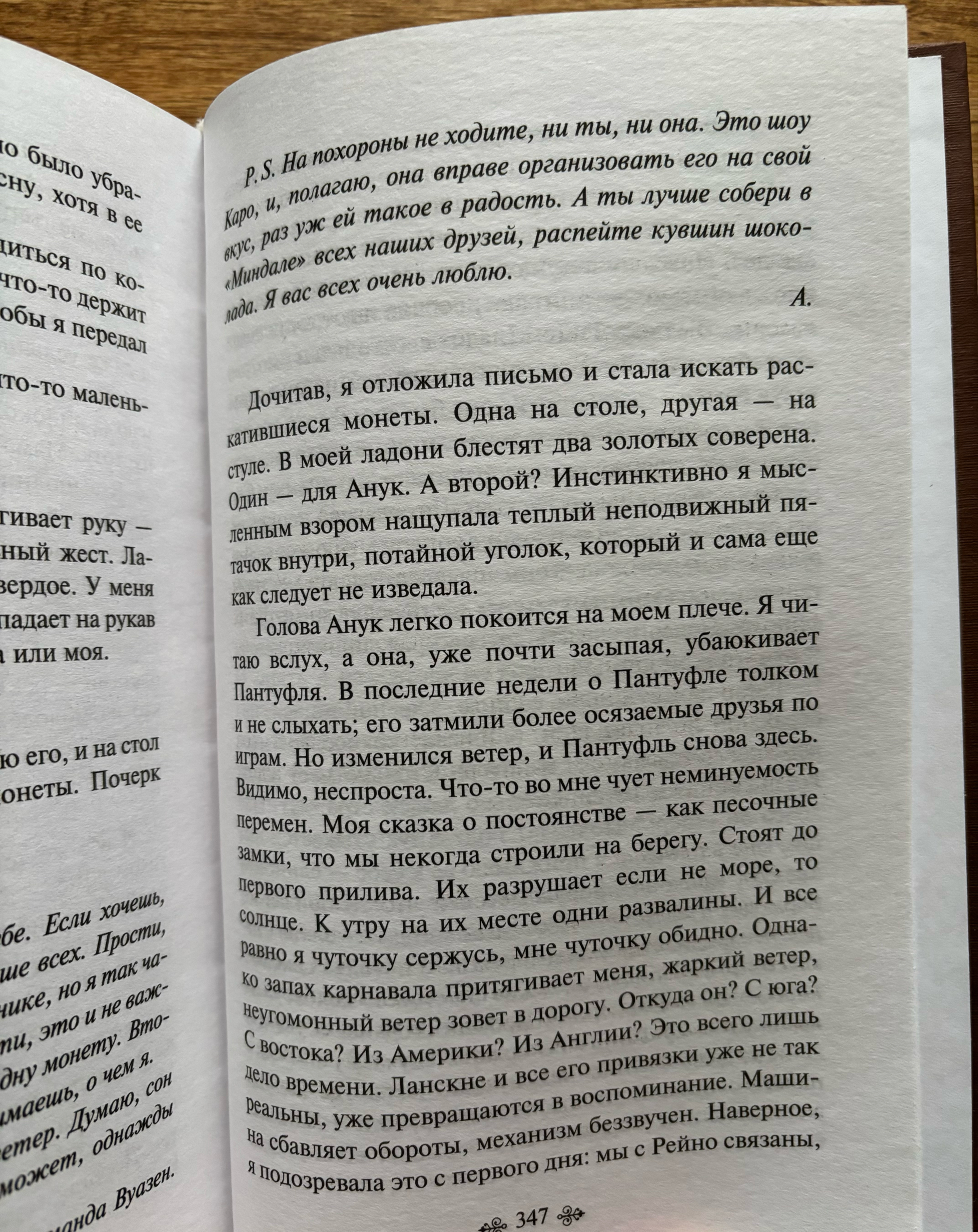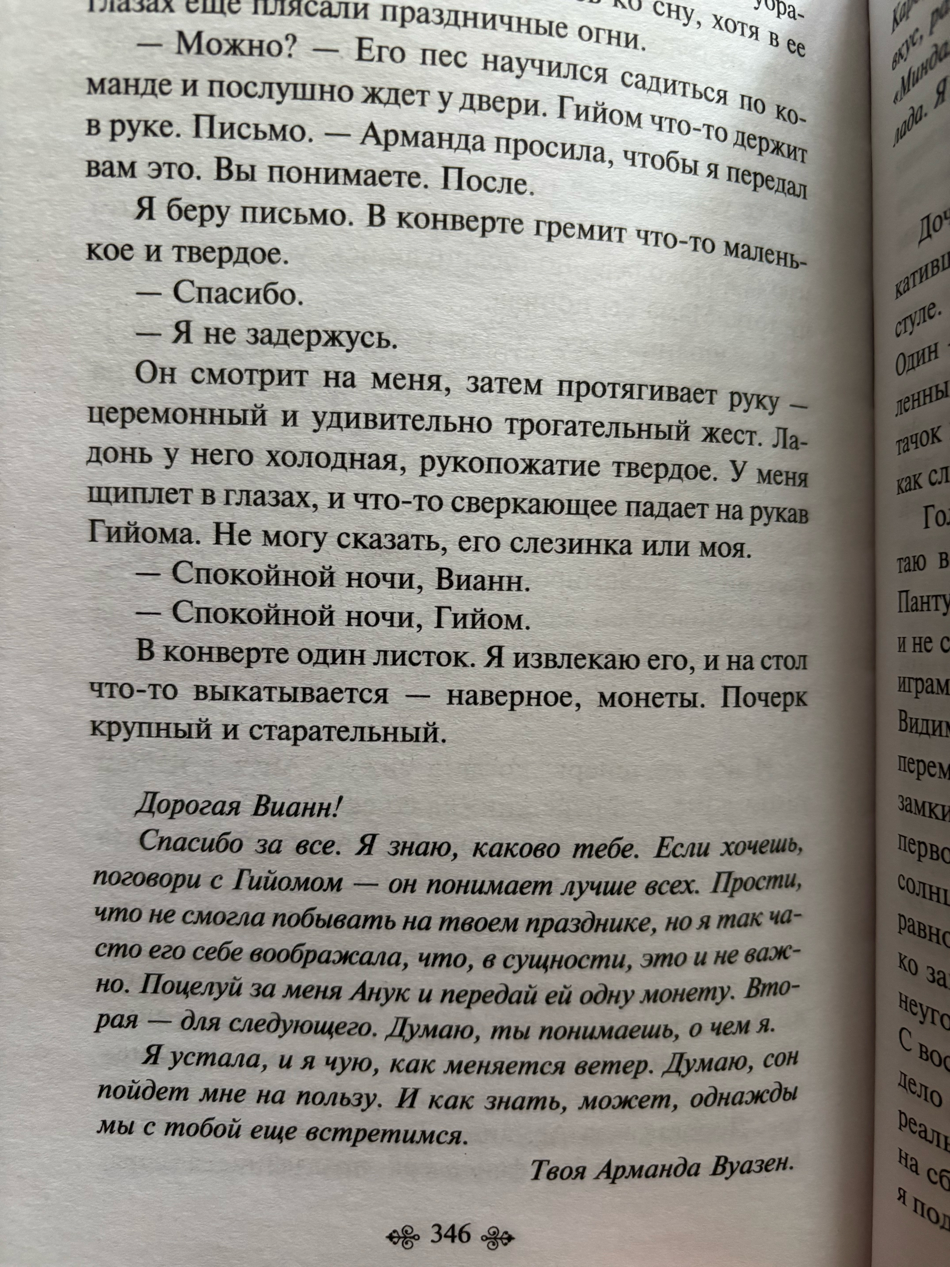 Просто волшебная книга! С ней вы гарантированно проведёте лучшие часы вашей жизни. Каждая страница будто пропитана шоколадом. Повествует эта книга о матери и дочери, которые в итоге ( если можно так сказать ) своего путешествия решают наконец-то остановится. Поселяются они в старом здании, которое станет самым обсуждаемым местом в городе ( ведь главная героиня сделает из этого здания конфетку ;) ). Повествование ведётся сразу от двух лиц, и это так необычно и классно. Мы видим эмоции и чувства двух людей от которых с разных взглядов ведётся повествование. Безумно "вкусно" написано, не "замудреный", а очень приятный и "сладкий" язык. Книга просто невероятная, затронула много тем, и конечно душу. Невозможно остаться к этой книге равнодушным. Всем советую !!!!