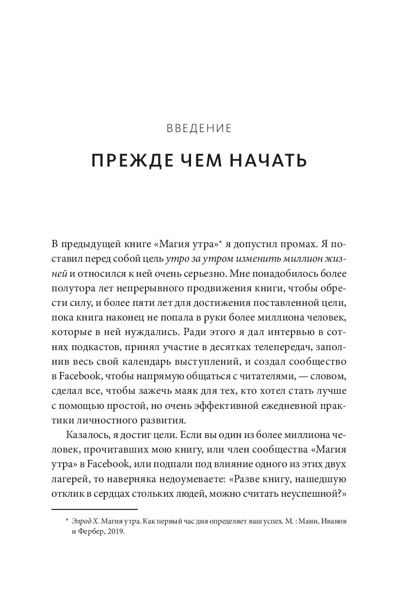 Несмотря на невероятный успех книги "Магия утра", Хэл Элрод не стал почивать на лаврах, ведь ему еще есть что сказать миру. Хэл обнаружил извечную формулу успеха, которой многие почему-то пренебрегают. В разные века ею пользовались виднейшие представители человечества. Столкнувшись с непреодолимыми препятствиями – от смертельно опасных травм и болезней до банкротства, они испытали ее в деле.