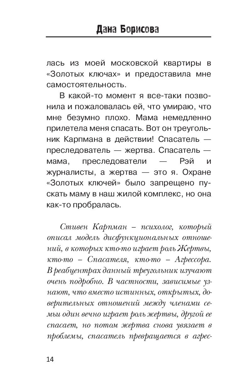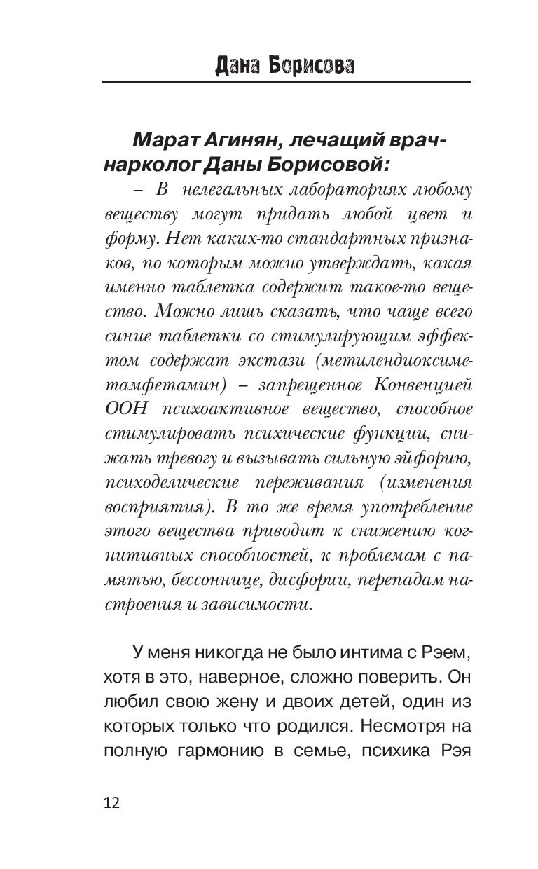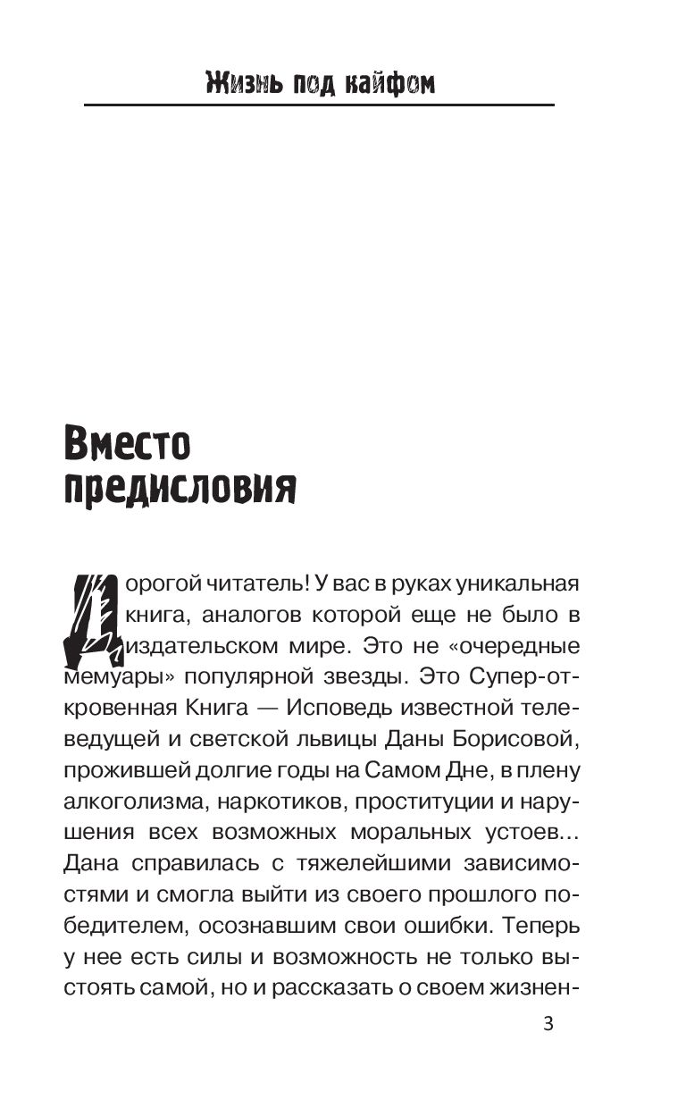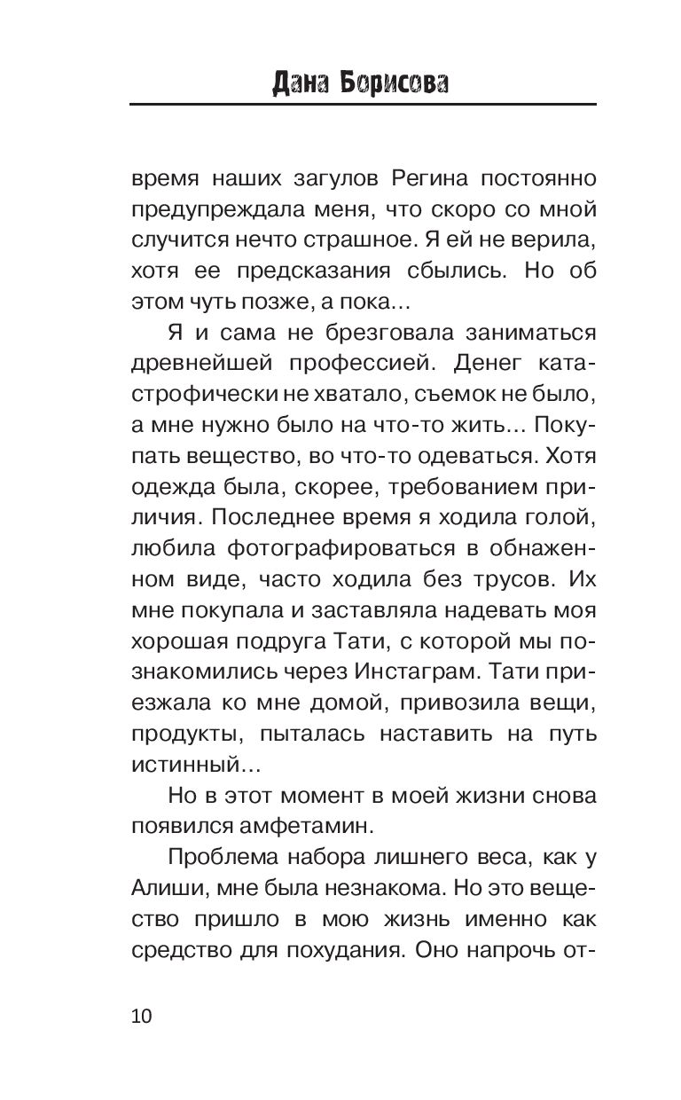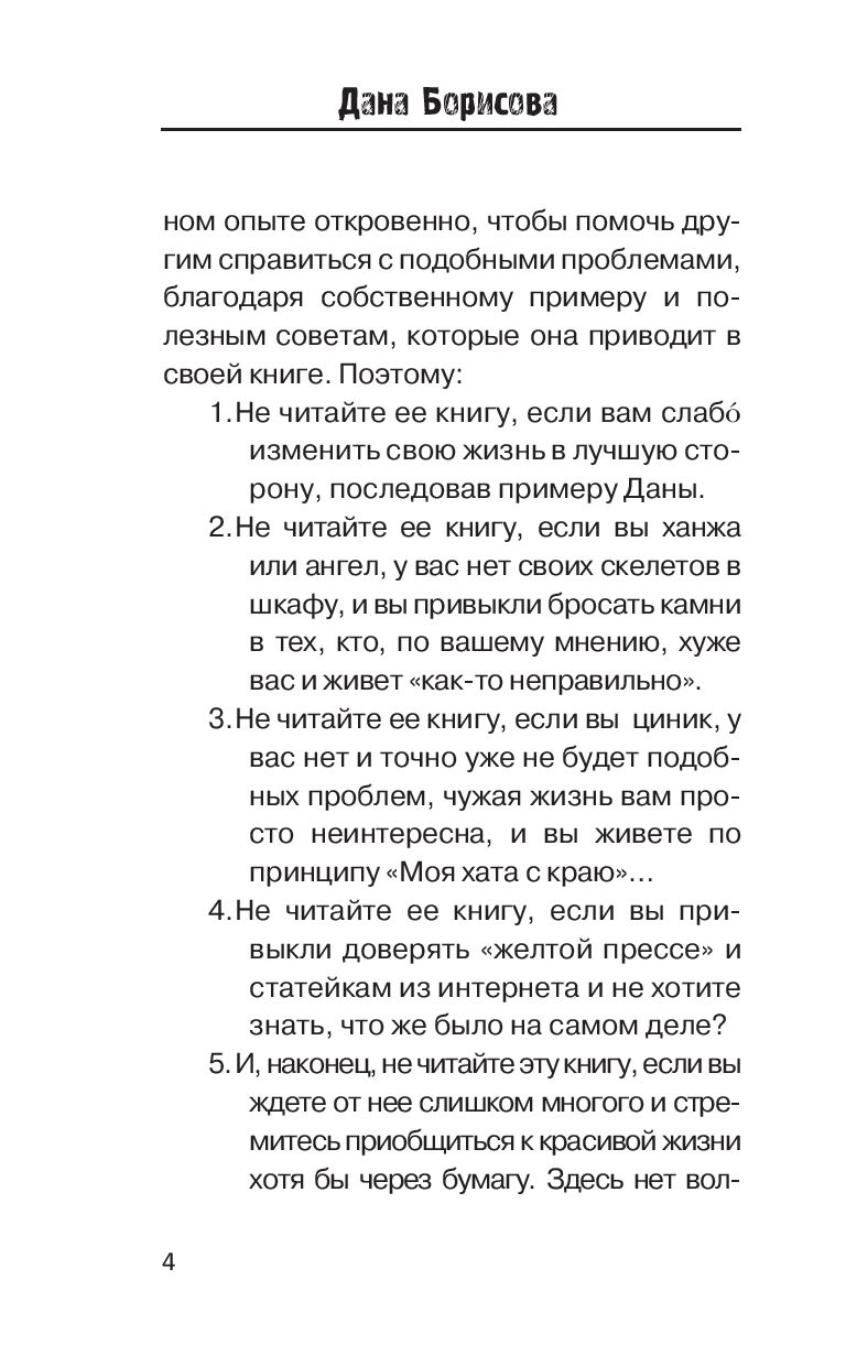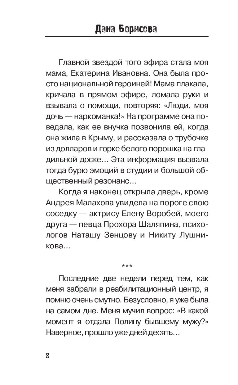 Супероткровенная исповедь известной телеведущей Даны Борисовой, прожившей долгие годы в плену алкоголизма, наркотиков и проституции... Дана справилась с тяжелейшими зависимостями, смогла выйти из своего прошлого победителем. Теперь у нее есть силы и возможность не только выстоять самой, но и рассказать о своем жизненном опыте откровенно. А также помочь другим справиться с подобными проблемами благодаря собственному примеру и полезным советам, которые она приводит в книге.