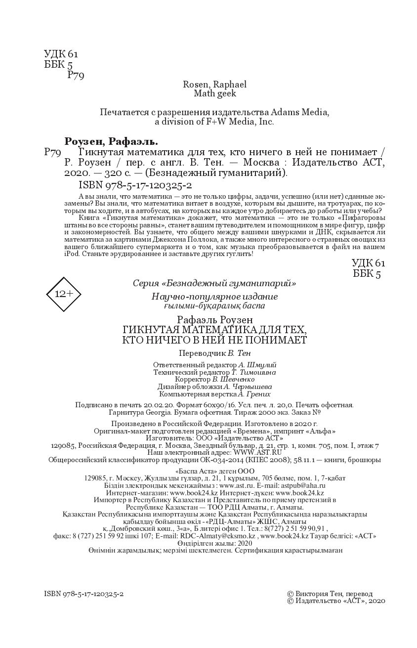Книга "Гикнутая математика" докажет, что математика – это не только "Пифагоровы штаны во все стороны равны", станет вашим путеводителем и помощником в мире фигур, цифр и закономерностей. Вы узнаете, что общего между вашими шнурками и ДНК, скрывается ли математика за картинами Джексона Поллока, а также много интересного о странных овощах из вашего ближайшего супермаркета и о том, как музыка преобразовывается в файл на вашем iPod. Станьте эрудированнее и заставьте других гуглить!