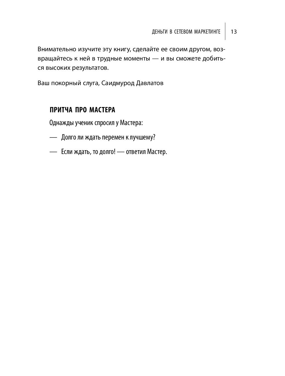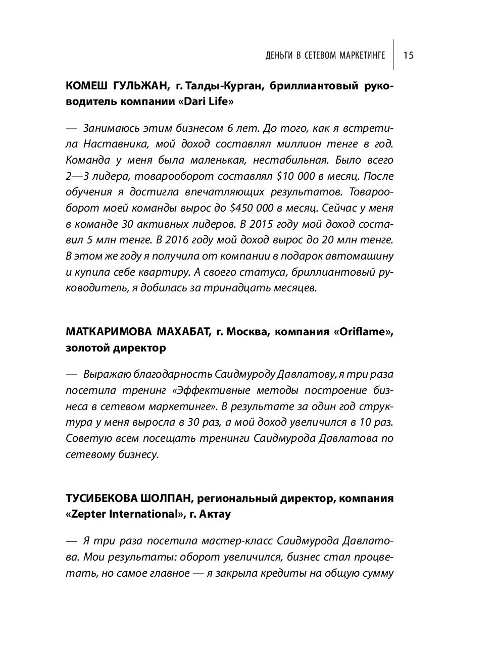 Сетевой маркетинг – особый вид бизнеса, в котором не требуется больших денежных вложений, а прибыль можно получить в максимально короткие сроки. Саидмурод Давлатов за 15 лет успел обучить принципам работы в этой области тысячи человек. Большинство из них добились впечатляющих результатов – стали руководителями в MLM-компаниях. В своей книге Саидмурод раскрывает все тонкости сетевого маркетинга и помогает новичкам избежать подводных камней на старте.