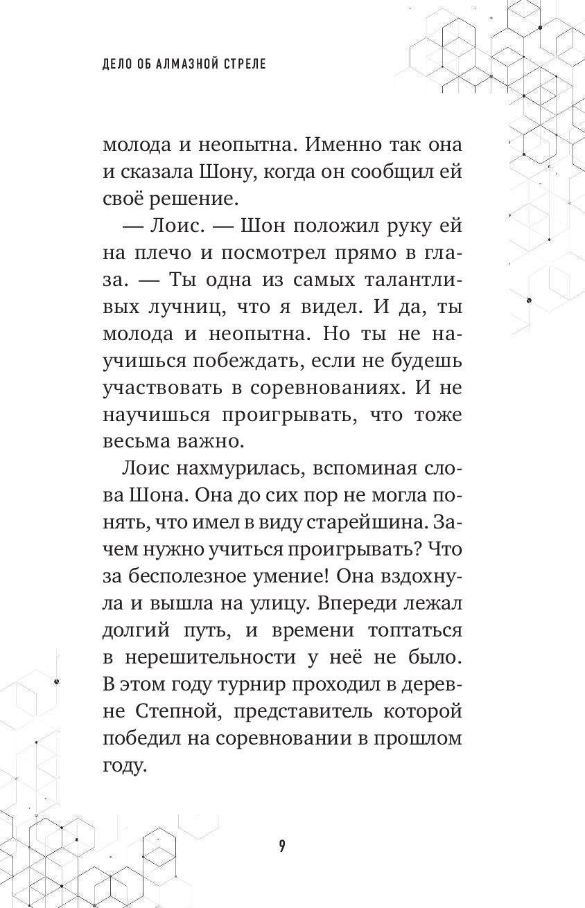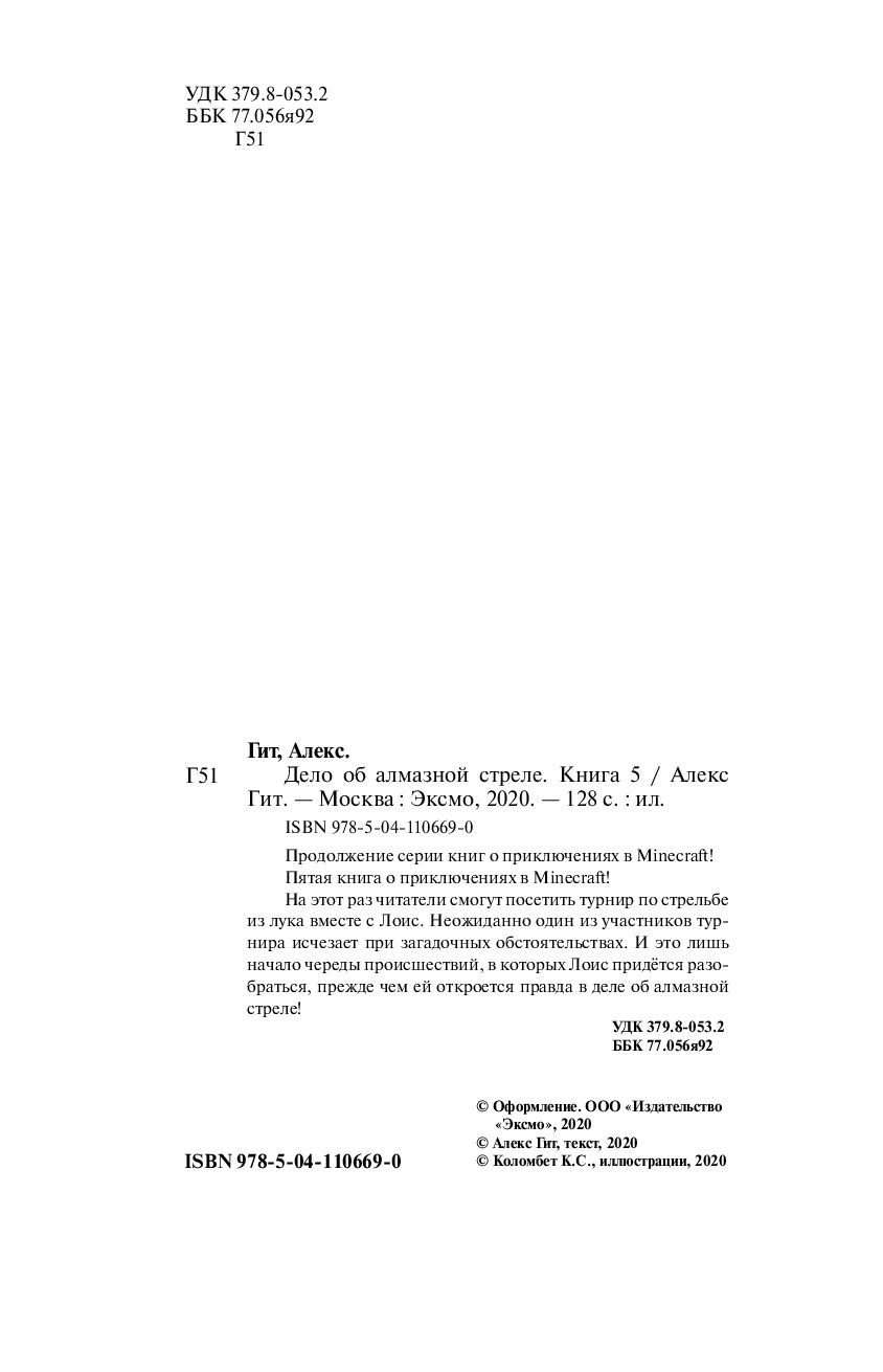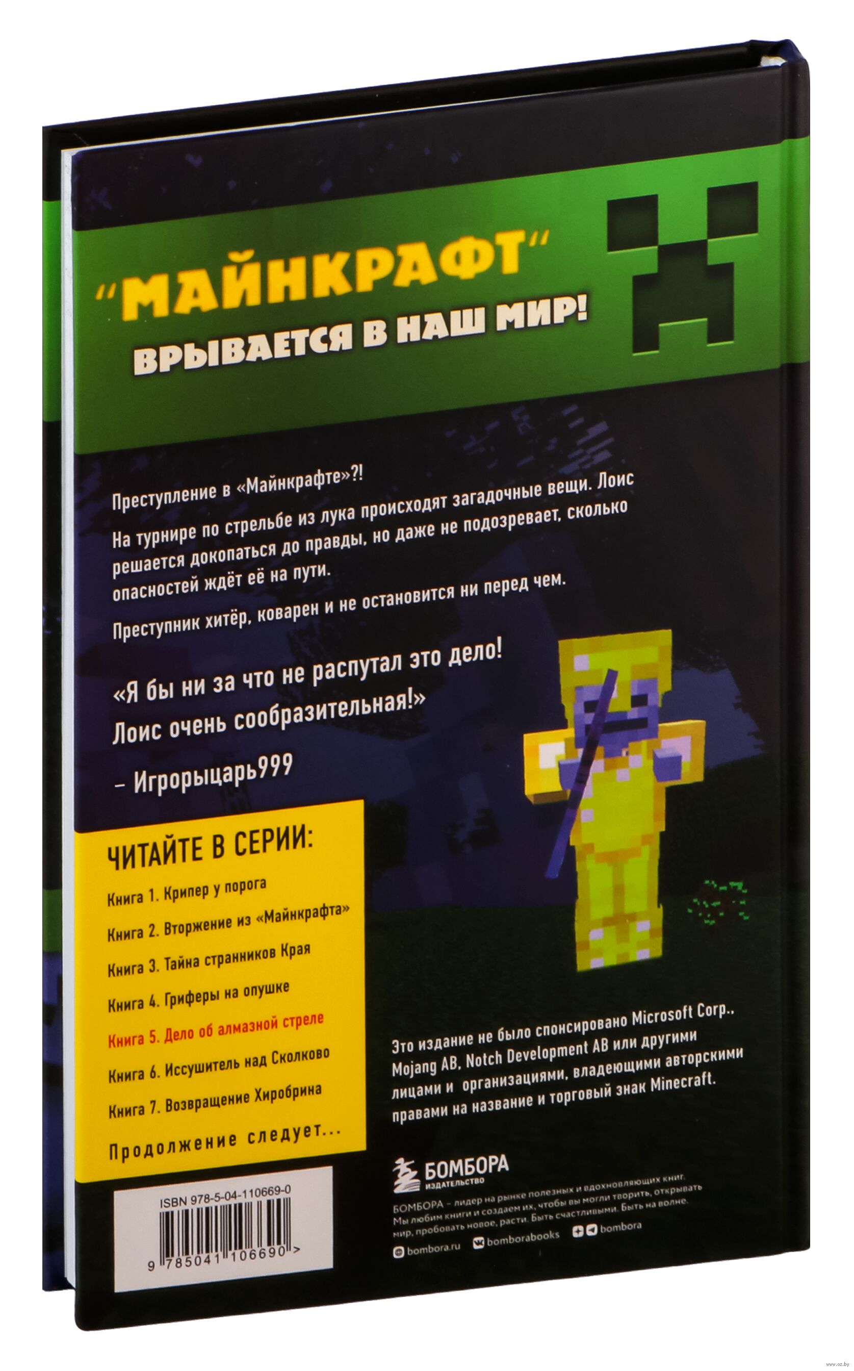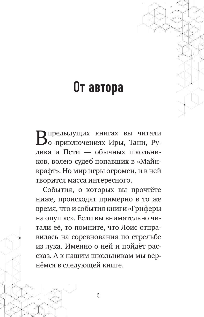 Продолжение серии книг о приключениях в Minecraft! Пятая книга о приключениях в Minecraft! На этот раз читатели смогут посетить турнир по стрельбе из лука вместе с Лоис. Неожиданно один из участников турнира исчезает при загадочных обстоятельствах. И это лишь начало череды происшествий, в которых Лоис придётся разобраться, прежде чем ей откроется правда в деле об алмазной стреле!