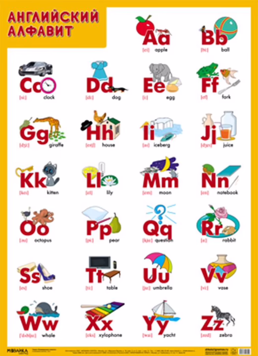 C помощью этого плаката ребенок сможет сделать первые шаги в изучении английского языка: выучить алфавит, познакомиться с произношением английских букв внутри слов, запомнить первые слова на иностранном языке.