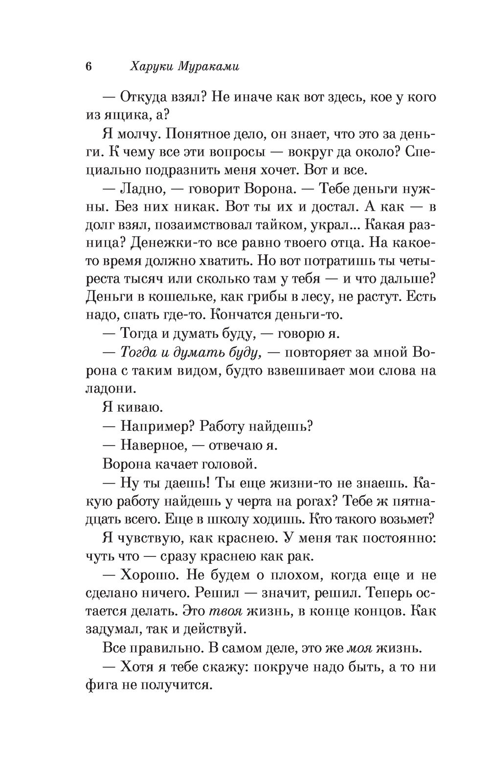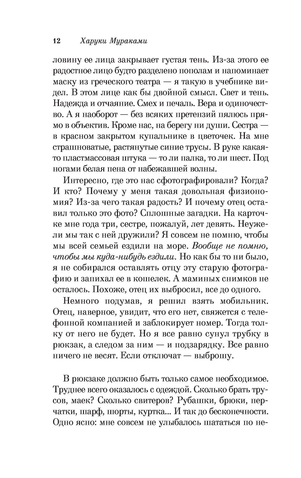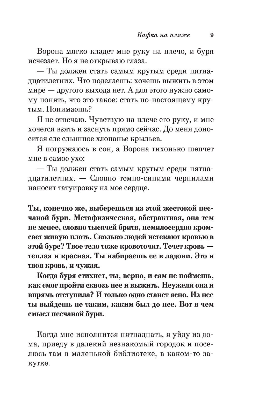 "Я заметил, что на груди белой майки налипло что-то черное, по форме – вроде большой бабочки с раскрытыми крыльями... В мерцающем свете люминесцентной лампы стало понятно: это темно-красное кровавое пятно. Кровь свежая, еще не засохла. Довольно много. Я наклонил голову и понюхал пятно. Никакого запаха. Брызги крови – совсем немного – оказались и на темно-синей рубашке, где она была не так заметна. А на белой майке – такая яркая, свежая..." Кошмарное странствие по лабиринтам души современного Эдипа – в романе Харуки Мураками "Кафка на пляже".