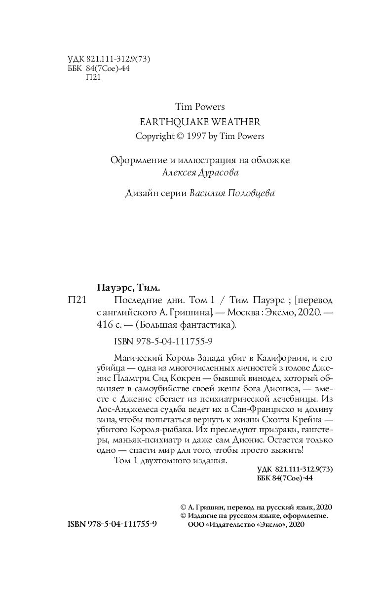 "Последние дни" – роман ведущего мастера интеллектуального фэнтези Тима Пауэрса. Окончание трилогии "Последней ставки" и "Последнего выдоха". Калифорнийский магический реализм от ученика Филипа К. Дика. Двухтомное издание.