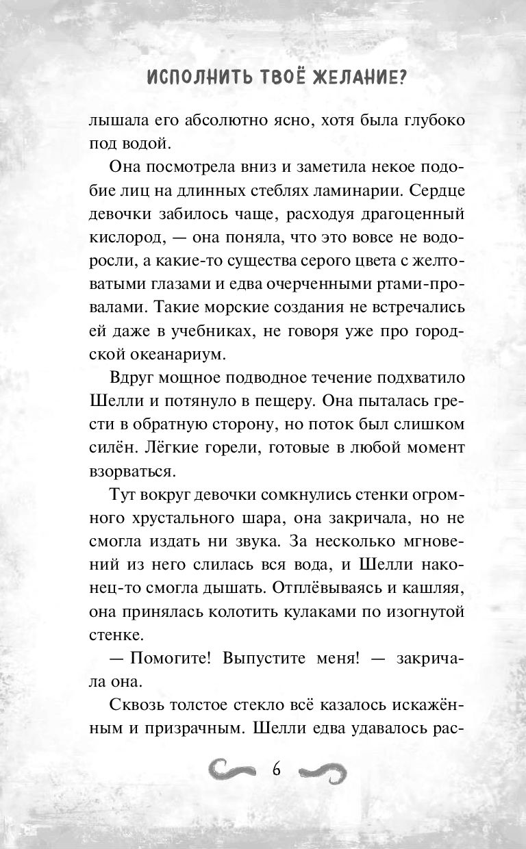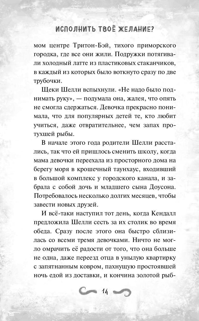 Если б было можно, Шелли жила бы в море. Уж лучше быть рыбой, чем жить как она: родители развелись, она никого не знает в новой школе, да ещё и продула последние соревнования по плаванию. Правда, теперь у неё появились подруги! И ничего, что девочки считают Шелли заучкой и даже (вот ведь ужас!) заставили выбросить в океан пластиковый стаканчик от кофе. С этого-то всё и началось. Сначала Шелли смыла волна, а потом и вовсе стали твориться чудеса: во сне она попала в пещеру к морской ведьме. Та обещала исполнить желание девочки...
