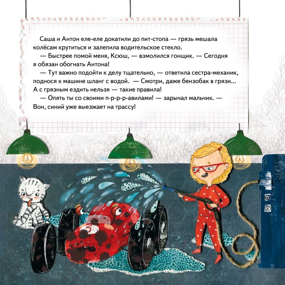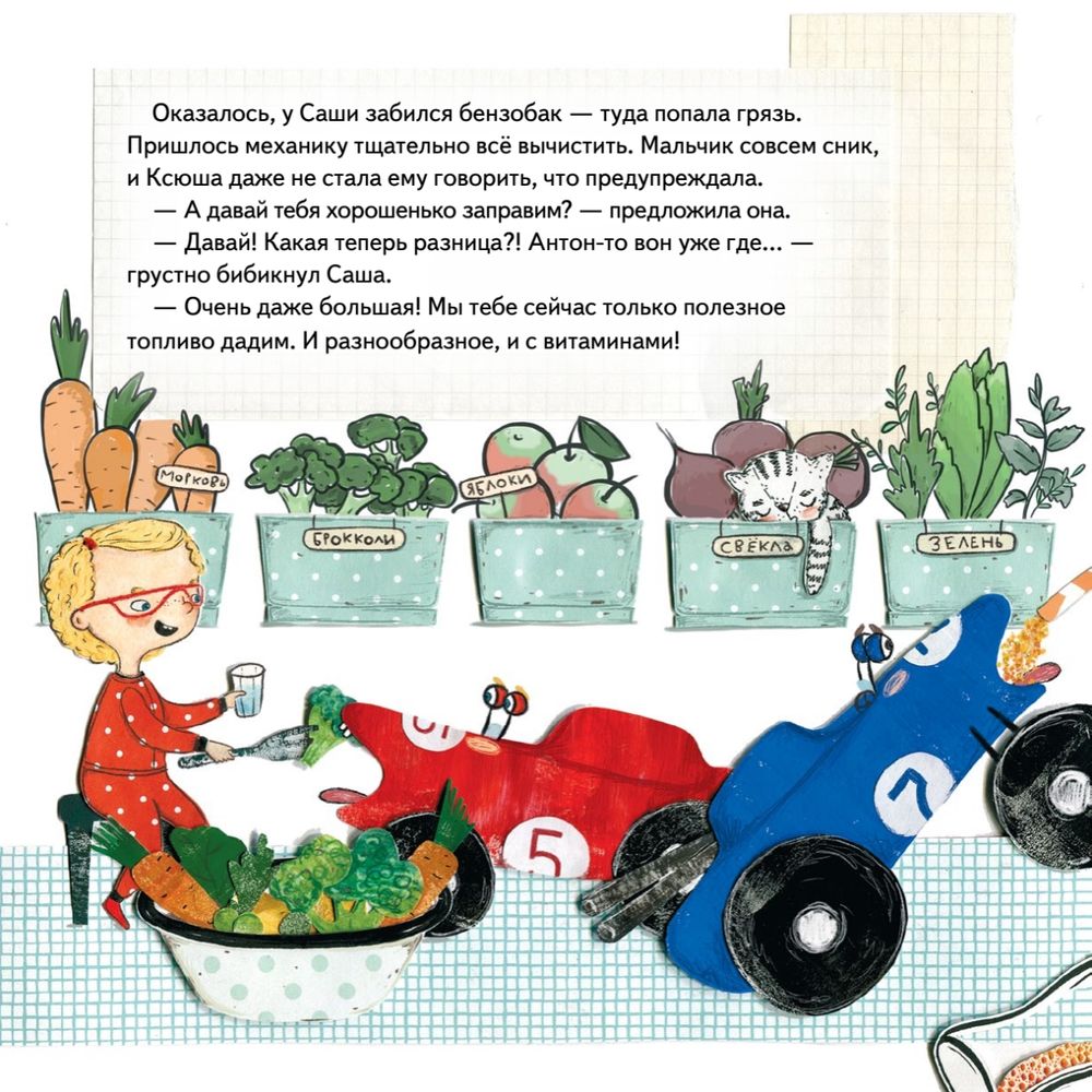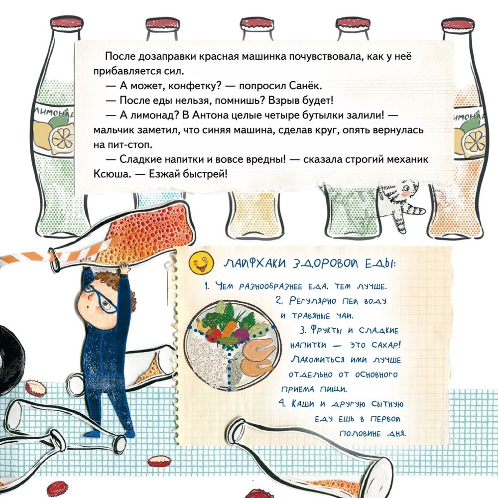 Чем же её заправлять? Бутербродами и конфетами или котлетами и супом? Какая машина едет лучше – чистая или грязная? С погнутым корпусом или прямая? Теперь Саша очень хочет выиграть гонку и готов соблюдать все правила эксплуатации!