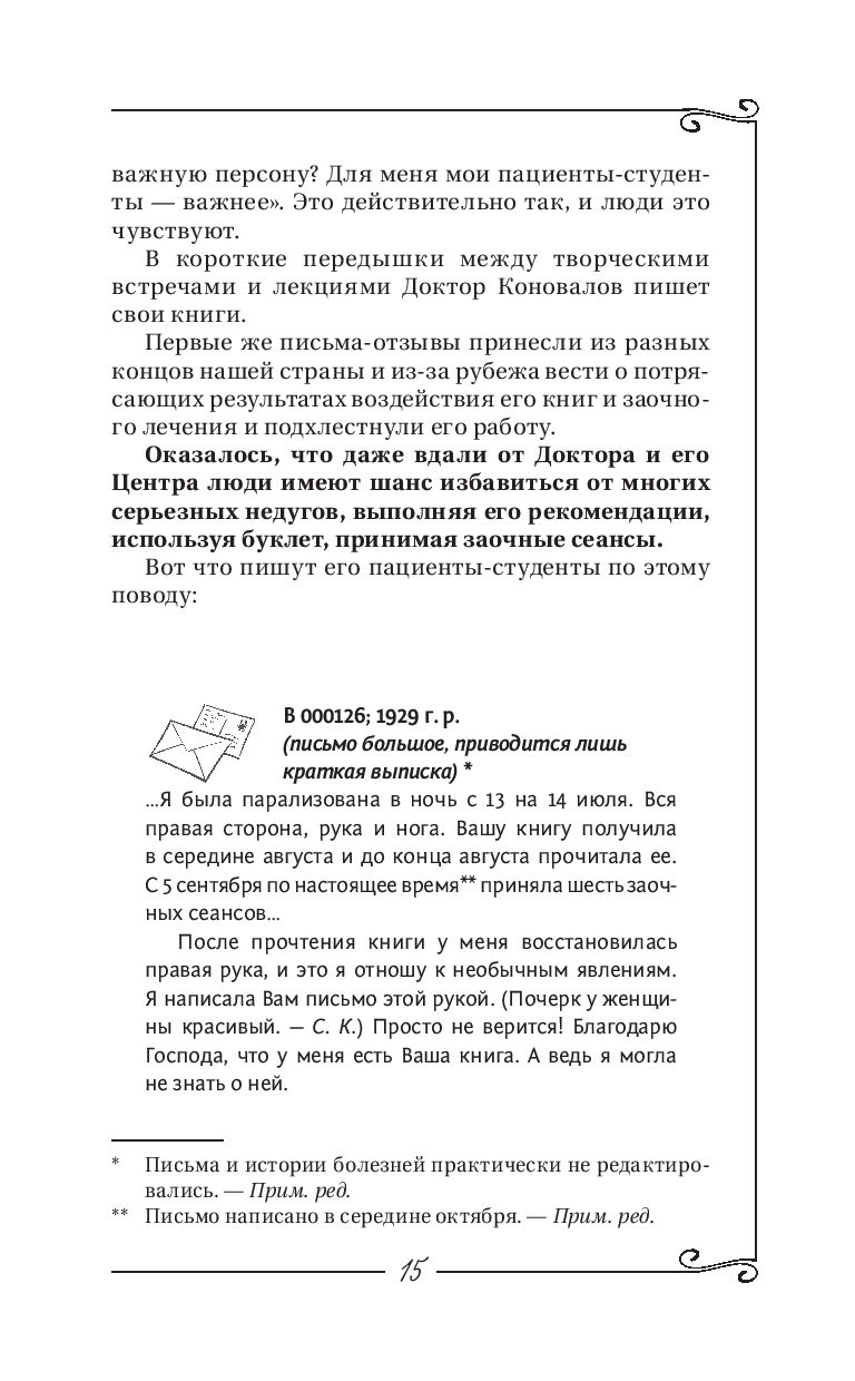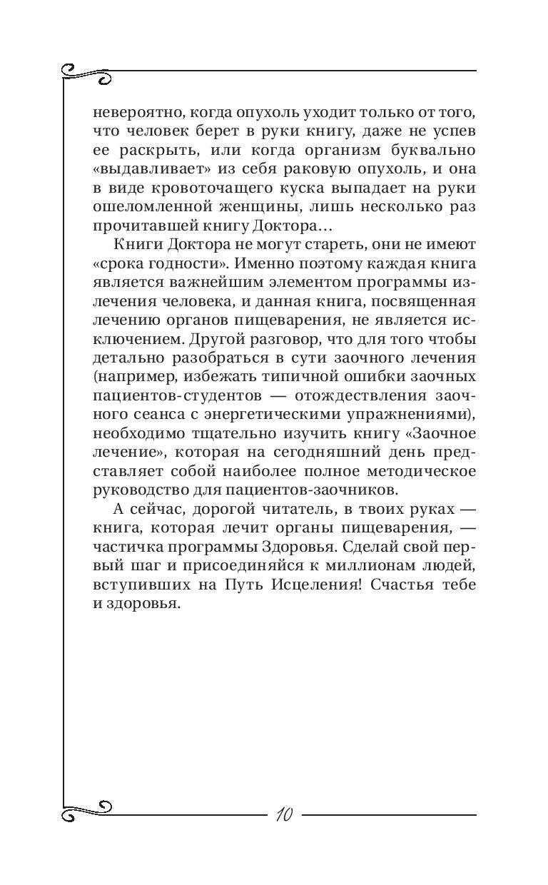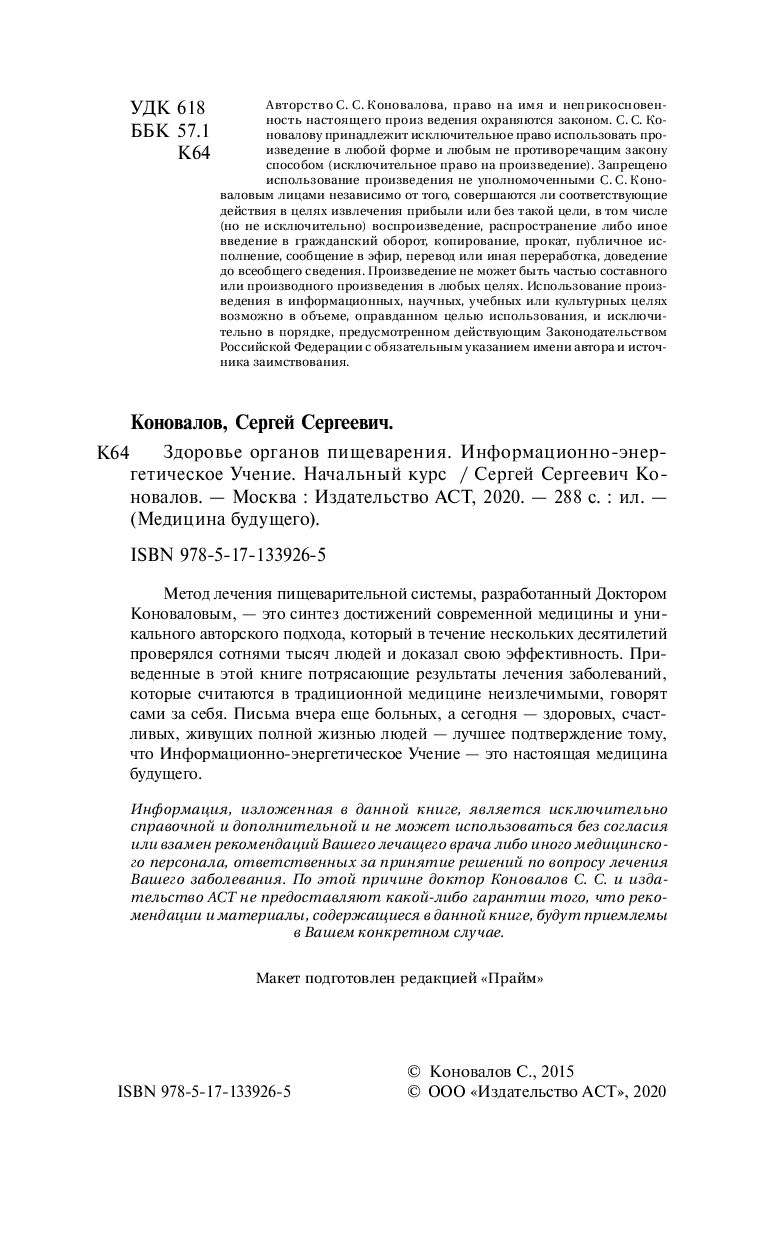 Метод лечения пищеварительной системы, разработанный Доктором Коноваловым, – это синтез достижений современной медицины и уникального авторского подхода, который в течение нескольких десятилетий проверялся сотнями тысяч людей и доказал свою эффективность. Приведенные в этой книге потрясающие результаты лечения заболеваний, которые считаются в традиционной медицине неизлечимыми, говорят сами за себя. Письма вчера еще больных, а сегодня – здоровых, счастливых, живущих полной жизнью людей – лучшее подтверждение тому, что Информационно-энергетическое Учение – это настоящая медицина будущего.