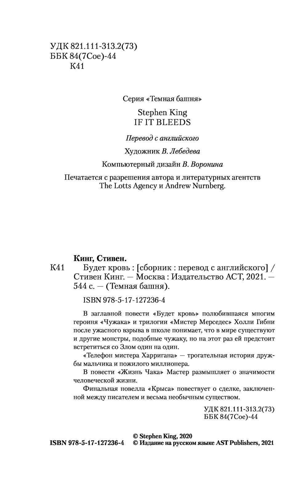 В заглавной повести "Будет кровь" полюбившаяся многим героиня "Чужака" и трилогии "Мистер Мерседес" Холли Гибни после ужасного взрыва в школе понимает, что в мире существуют и другие монстры, подобные чужаку, но на этот раз ей предстоит встретиться со Злом один на один.