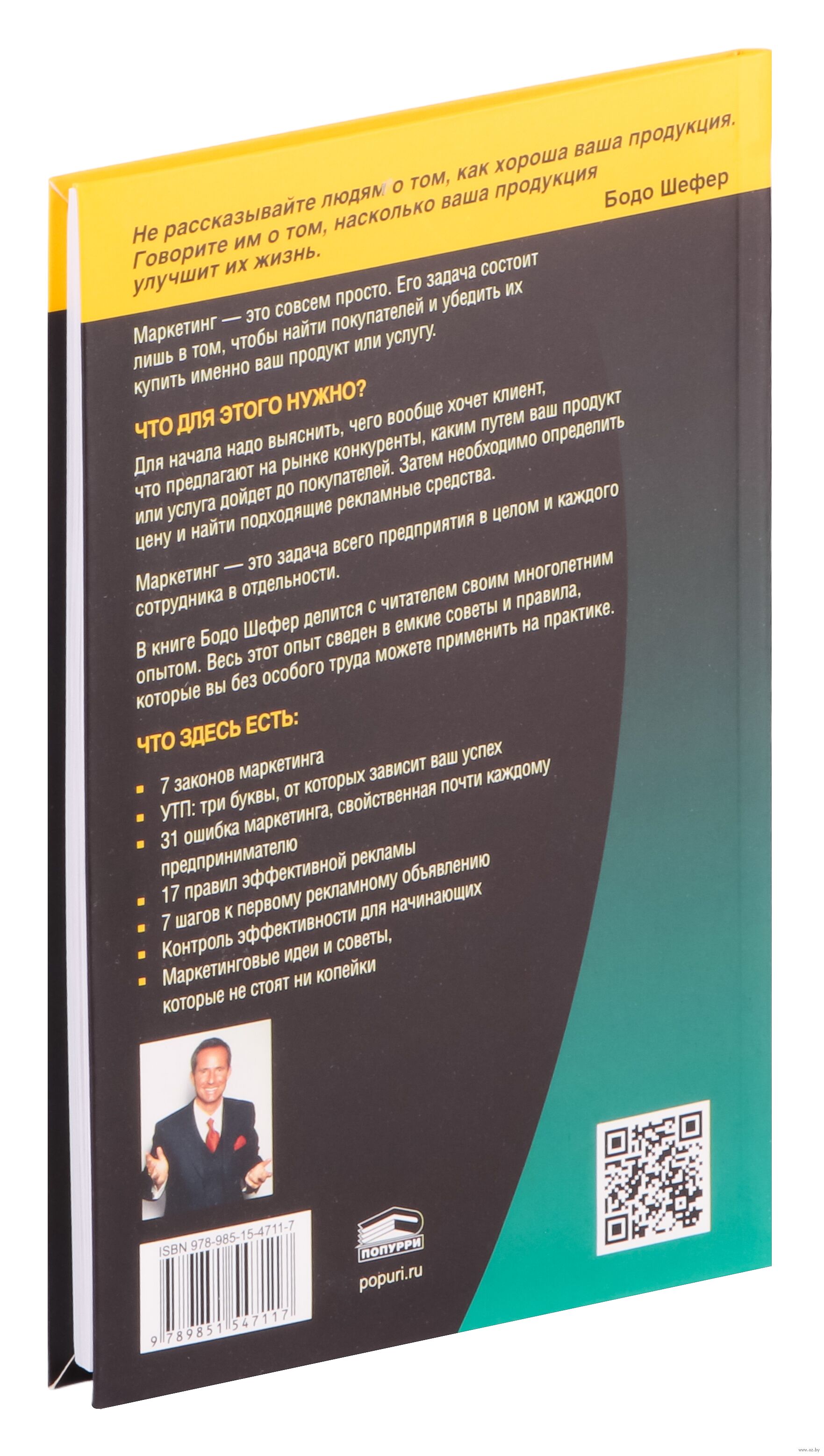 Маркетинг – это совсем просто. Его задача состоит лишь в том, чтобы найти покупателей и убедить их купить именно ваш продукт или услугу. Что для этого нужно? В новой книге Бодо Шефер делится с читателем своим многолетним опытом. Весь этот опыт сведён в ёмкие советы и правила, которые вы без особого труда можете применить на практике.