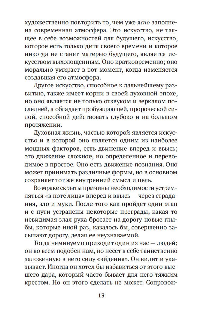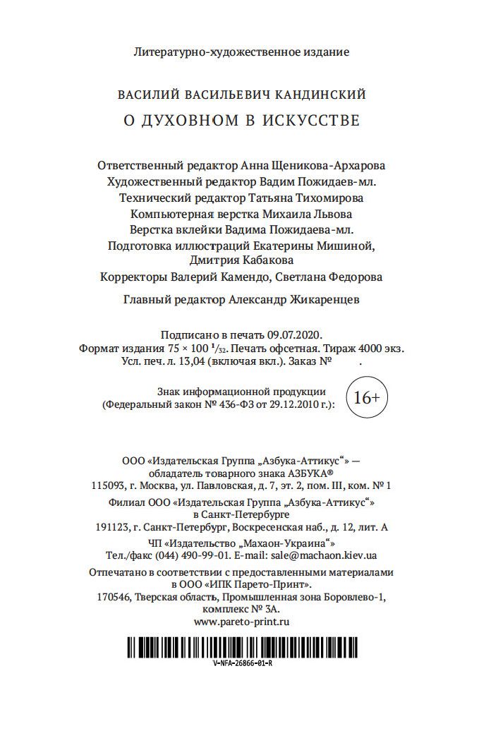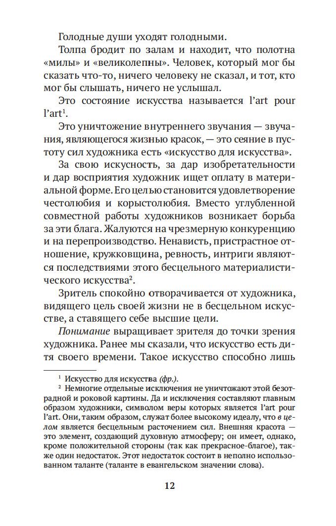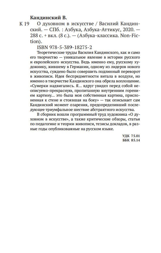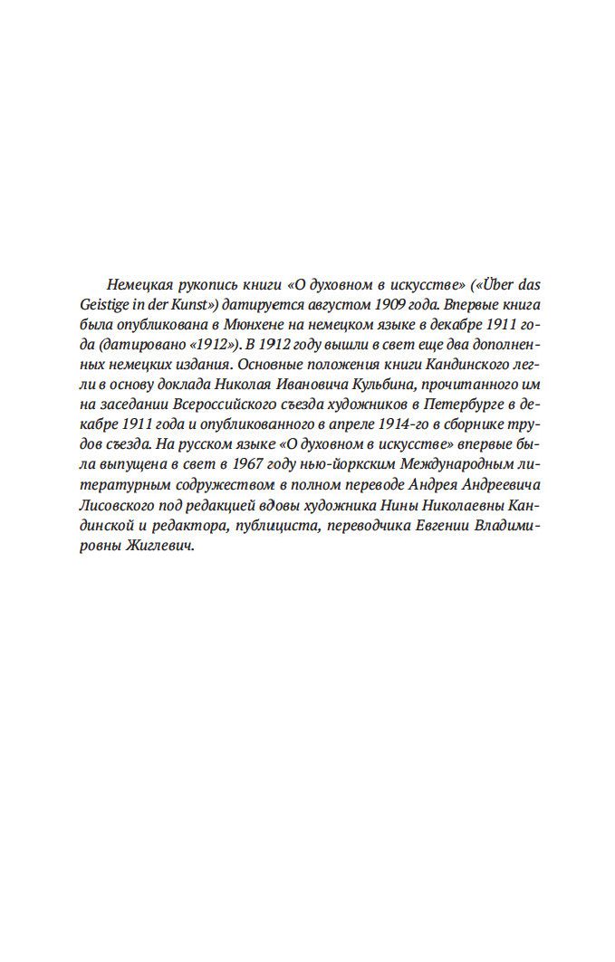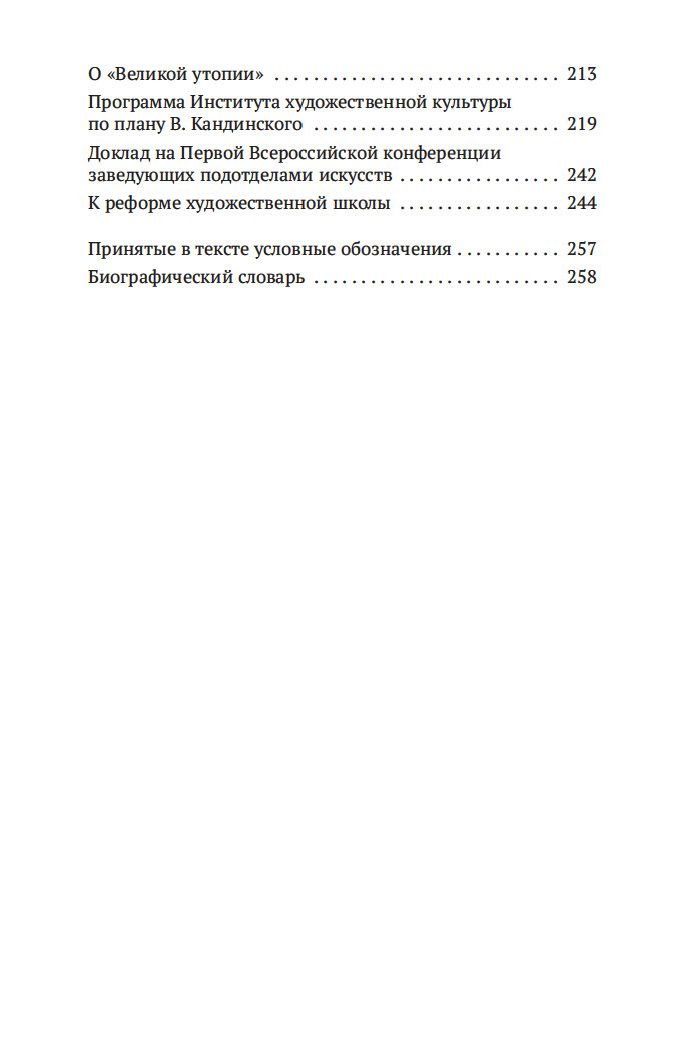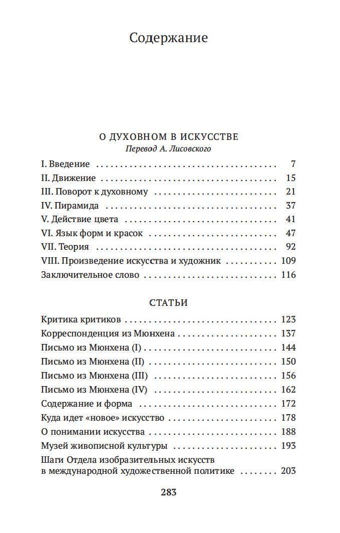 В сборник вошли программный труд художника "О духовном в искусстве", а также критические обзоры, статьи по педагогике и теории живописи, тезисы докладов, в разные годы опубликованные на русском языке.