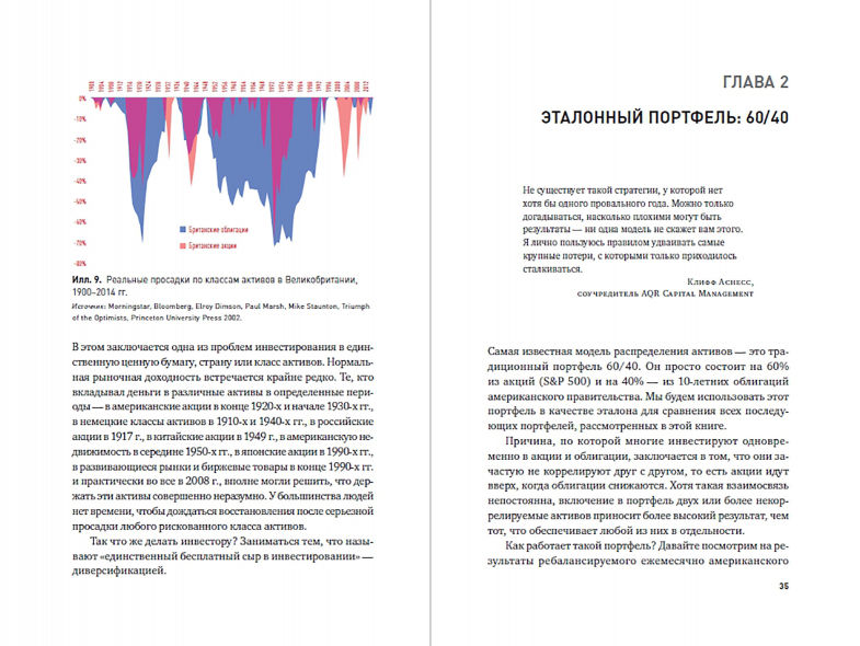 В книге отслеживается 13 видов активов и их доходности с 1973 г., при этом особое внимание уделяется таким широко известным инвестиционным портфелям, как всесезонный портфель Рэя Далио, портфели эндаумент-фондов, портфель Уоррена Баффетта.