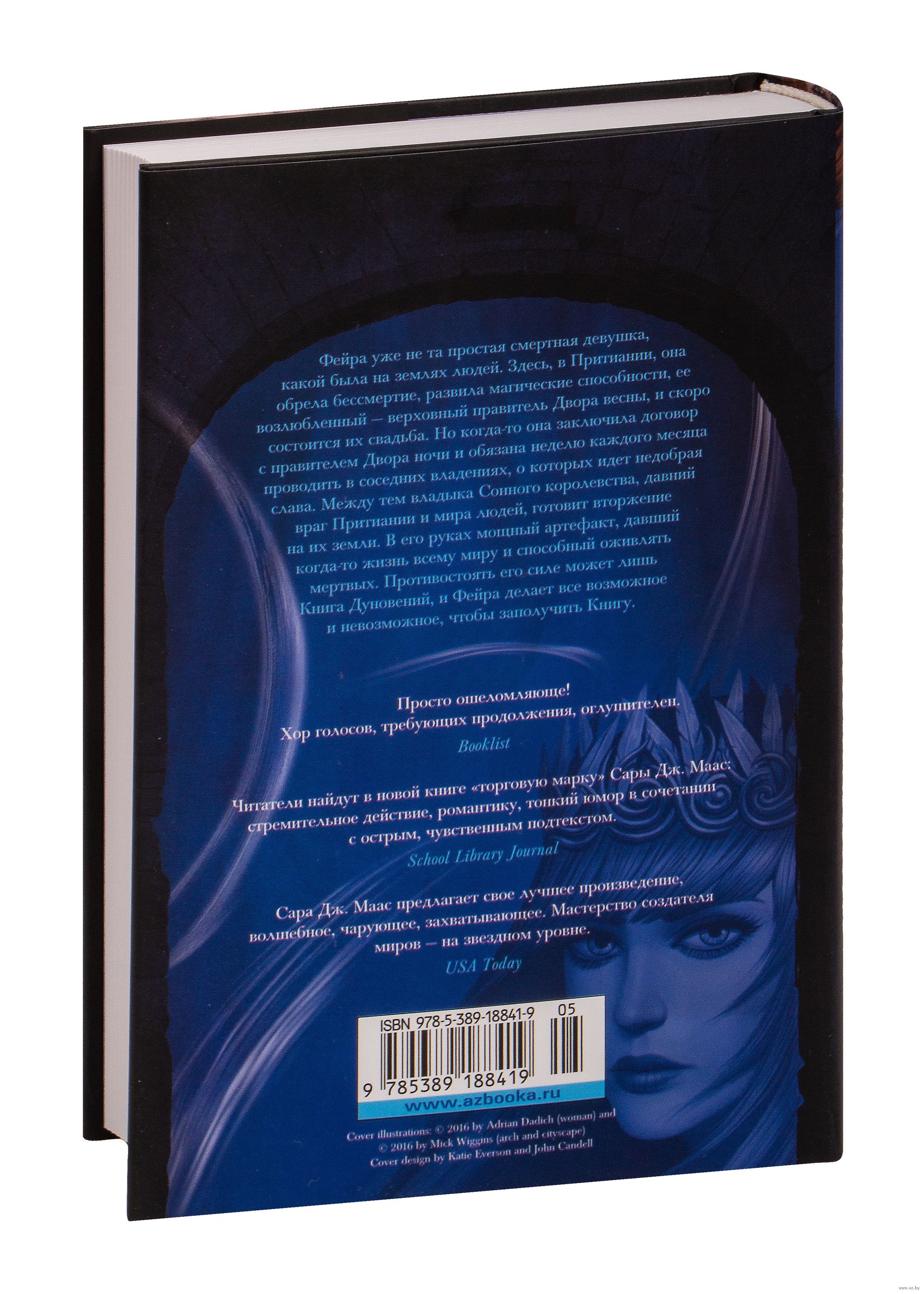 Между тем владыка Сонного королевства, давний враг Притиании и мира людей, готовит вторжение на их земли. В его руках мощный артефакт, давший когда-то жизнь всему миру и способный оживлять мертвых. Противостоять его силе может лишь Книга Дуновений, и Фейра делает все возможное и невозможное, чтобы заполучить Книгу.