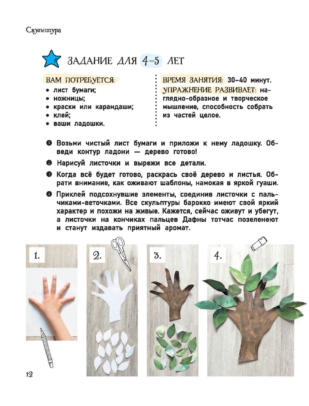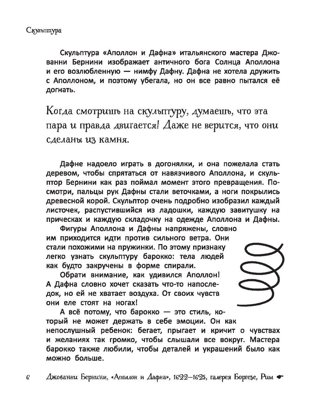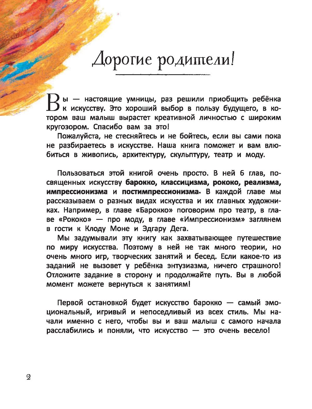 Мы задумывали эту книгу как захватывающее путешествие по миру искусства для вашего ребенка, где он сможет в увлекательной форме познакомиться с основными стилями, увидеть величайшие мировые скульптуры, шедевры живописи и архитектуры. Но помимо теории его ждёт множество творческих заданий и занимательных игр, которые помогут малышу проявить собственную инициативу и прочувствовать влияние большого искусства!