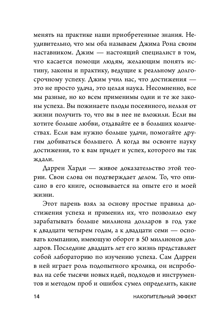 Маленькими шагами к большим целям – именно в этом заключается смысл накопительного эффекта. Сформулировал его миллионер, предприниматель и лайф-коуч Даррен Харди. Свой первый миллион он заработал в 24 года, а в 27 его компания имела оборот в 50 миллионов долларов. В книге автор приводит 6 стратегий успеха, но напоминает, что секретным ингредиентом к каждой из них является именно накопительный эффект.
