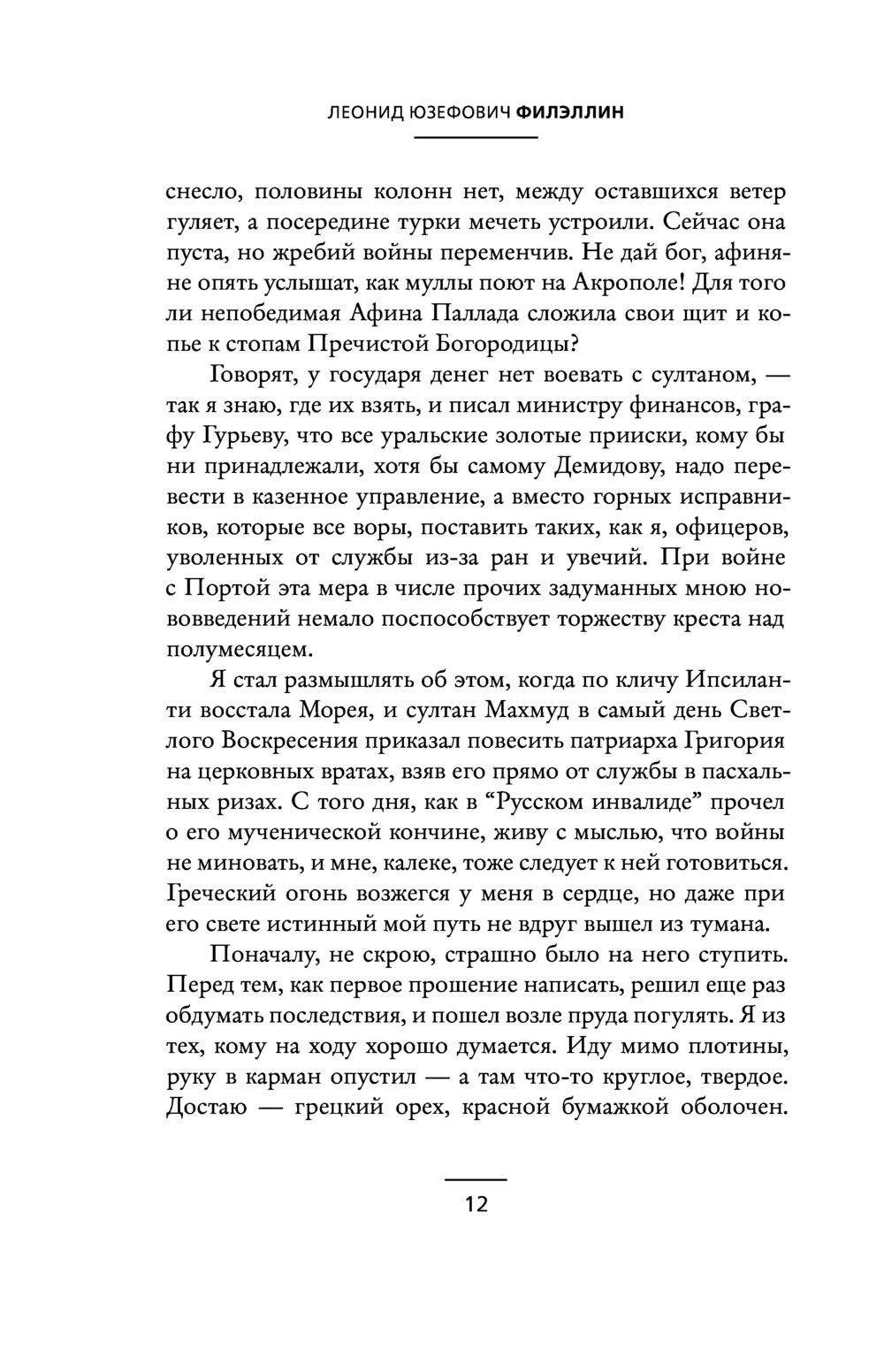 Филэллин – "любящий греков". В 20-х годах XIX века так стали называть тех, кто сочувствовал борьбе греческих повстанцев с Османской империей или принимал в ней непосредственное участие. Филэллином, как отправившийся в Грецию и умерший там Байрон, считает себя главный герой романа, отставной штабс-капитан Григорий Мосцепанов. Это персонаж вымышленный. В отличие от моих документальных книг, здесь я дал волю воображению, но свои узоры расшивал по канве подлинных событий. Действие завязывается в Нижнетагильских заводах, продолжается в Екатеринбурге, Перми, Царском Селе, Таганроге, из России переносится в Навплион и Александрию, и завершается в Афинах, на Акрополе. Среди центральных героев романа – Александр I, баронесса-мистик Юлия Криднер, египетский полководец Ибрагим-паша, другие реальные фигуры, однако моя роль не сводилась к выбору цветов при их раскрашивании. Реконструкция прошлого не была моей целью. "Филэллин" – скорее вариации на исторические темы, чем традиционный исторический роман.
