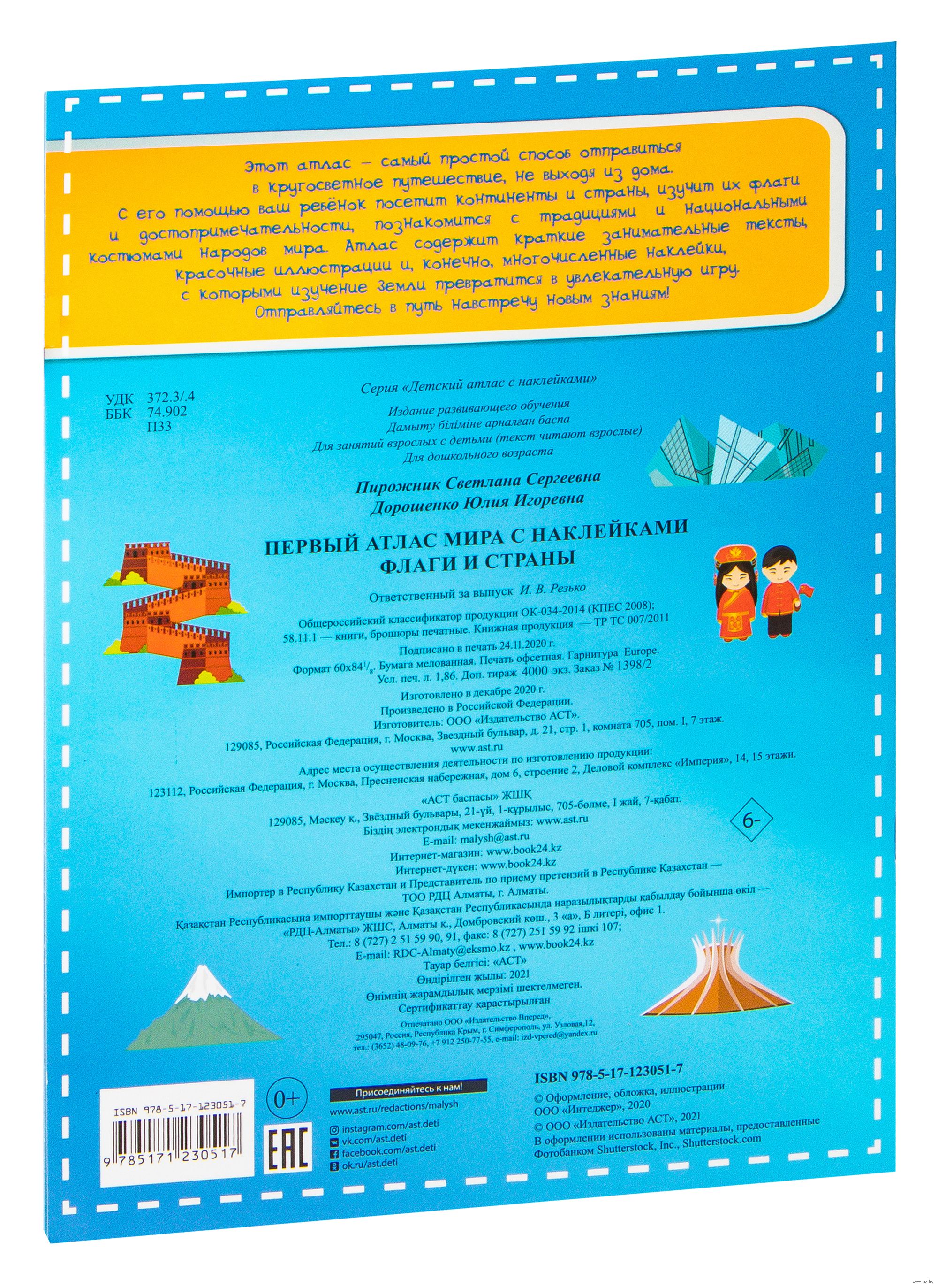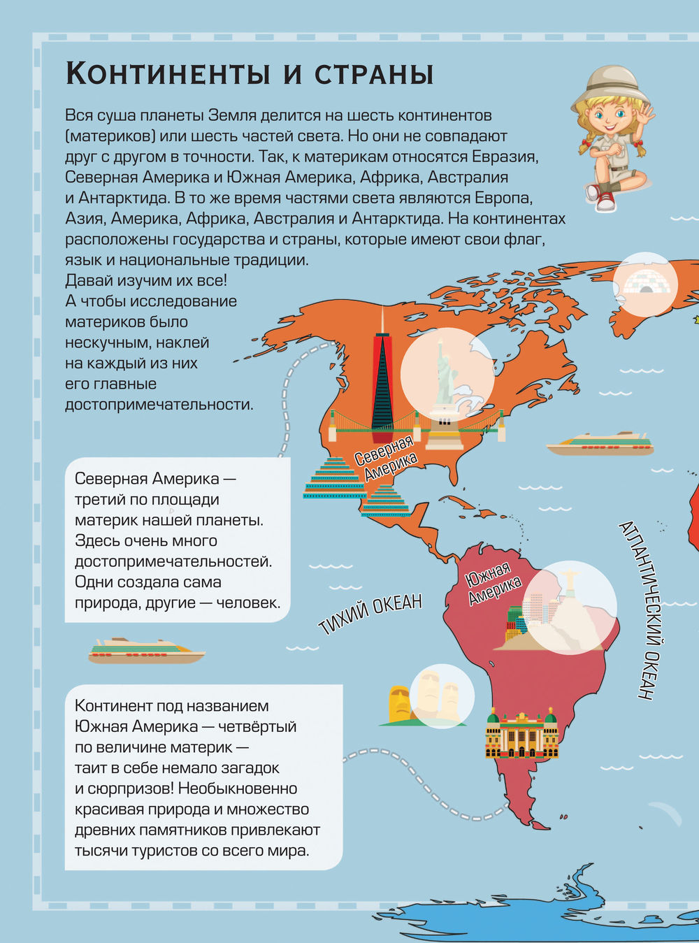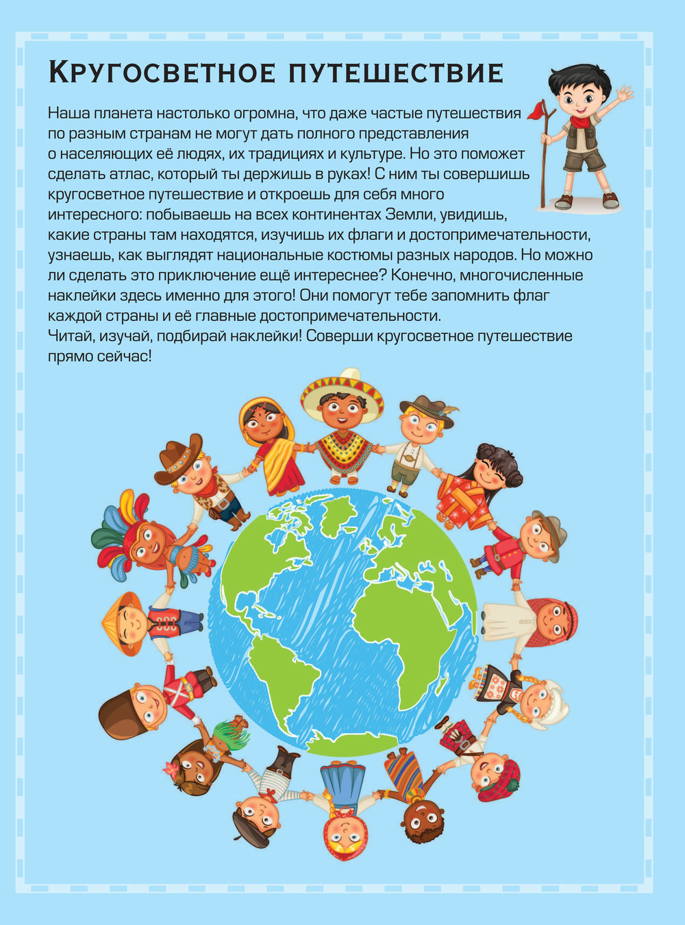 Этот атлас – самый простой способ отправиться в кругосветное путешествие, не выходя из дома. С его помощью ваш ребёнок посетит континенты и страны, изучит их флаги и достопримечательности, познакомится с традициями и национальными костюмами народов мира. Атлас содержит краткие занимательные тексты, красочные иллюстрации и, конечно, многочисленные наклейки, с которыми изучение Земли превратится в увлекательную игру.