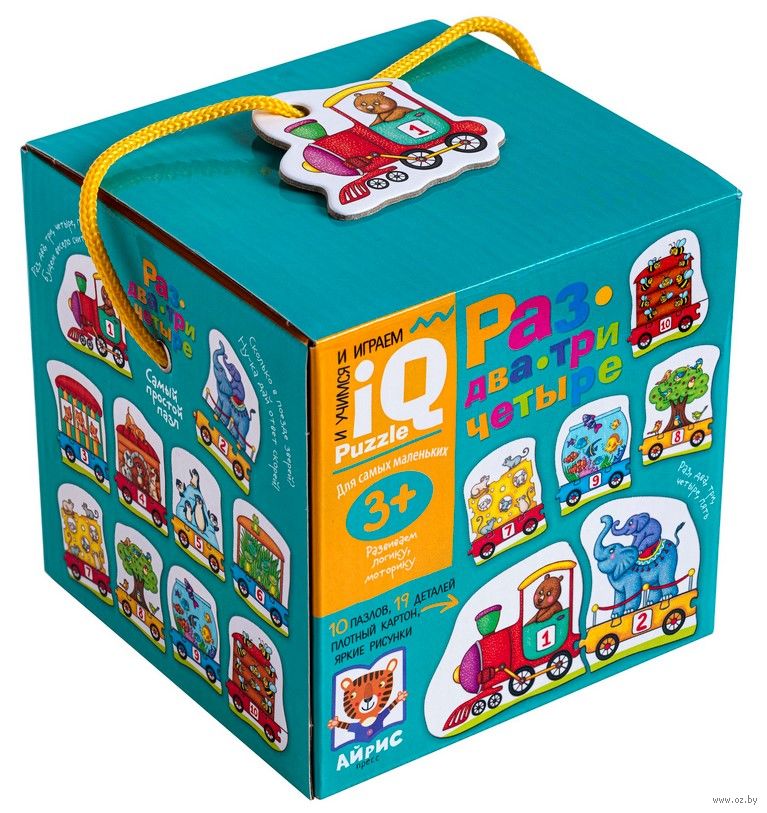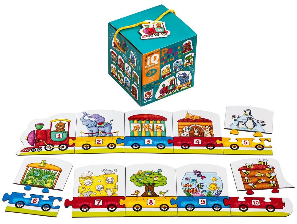 Пазлы "Раз, два, три, четыре" – это увлекательная настольная игра для развития навыков счёта и мелкой моторики. В наборе 10 пазлов в виде поезда, в котором едут животные. У каждого вагона свой номер. Нужно сложить пазл так, чтобы количество животных и число на вагоне совпадали.