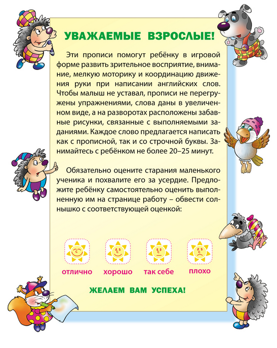 Эти прописи помогут ребёнку в игровой форме развить зрительное восприятие, внимание, мелкую моторику и координацию движения руки при написании английских букв. Чтобы малыш не уставал прописи не перегружены упражнениями, буквы даны в увеличенном виде, а на разворотах расположены забавные рисунки, связанные с выполняемыми заданиями. Стрелки указывают начало каждого безотрывного движения руки при написании буквы по точкам. Занимайтесь с ребенком не более 20-25 минут.