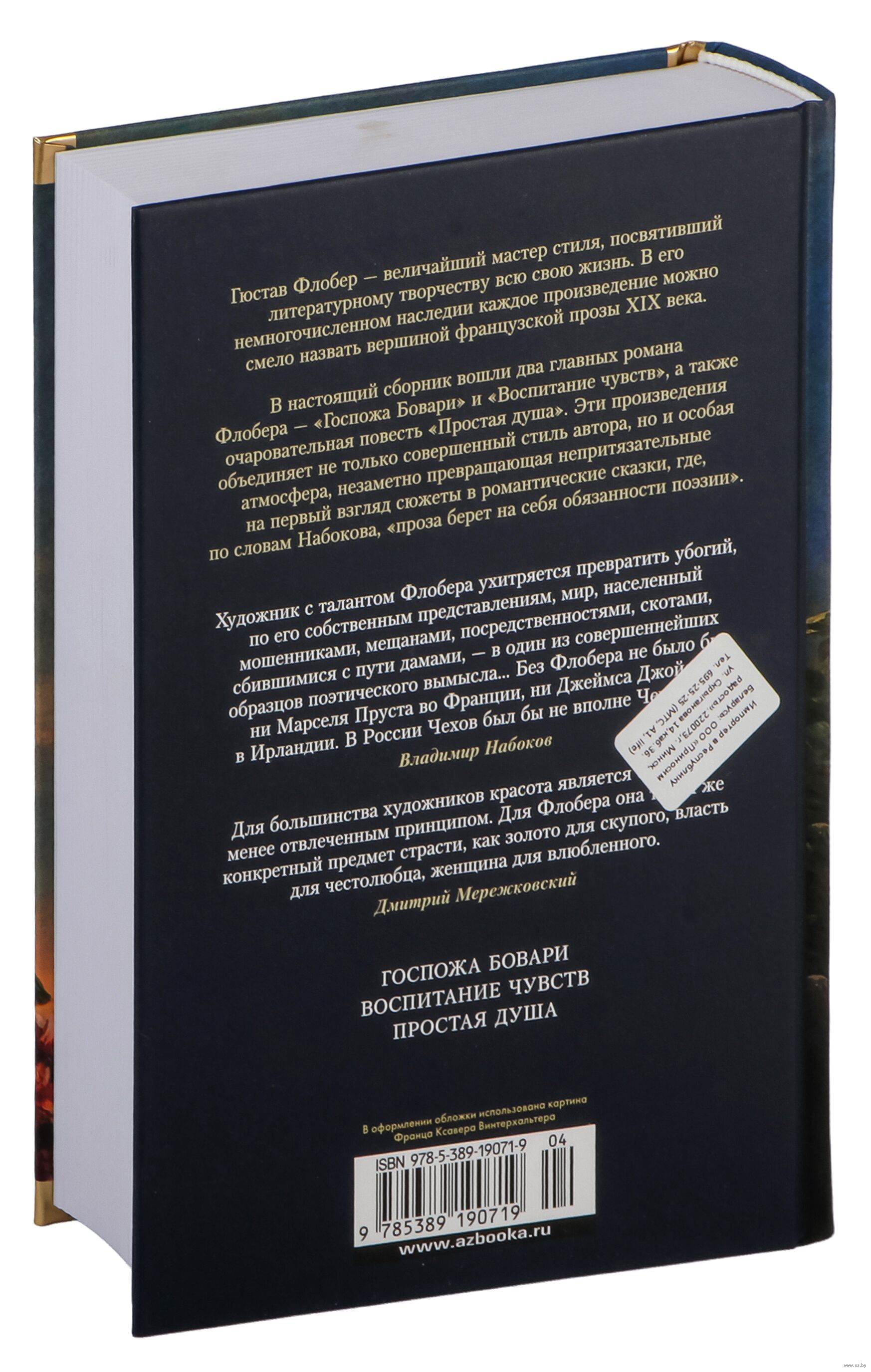 В настоящий сборник вошли два главных романа Флобера – "Госпожа Бовари" и "Воспитание чувств", а также очаровательная повесть "Простая душа". Эти произведения объединяет не только совершенный стиль автора, но и особая атмосфера, незаметно превращающая непритязательные на первый взгляд сюжеты в романтические сказки, где, по словам Набокова, "проза берет на себя обязанности поэзии".