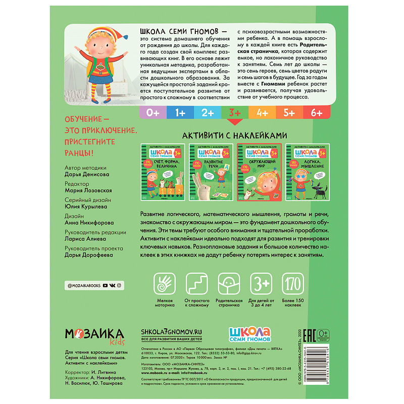 Книга "Окружающий мир 3+" из серии "Школа Семи Гномов". Активити с наклейками» предназначена для расширения кругозора и знаний об окружающем мире детей от 3 до 4 лет.