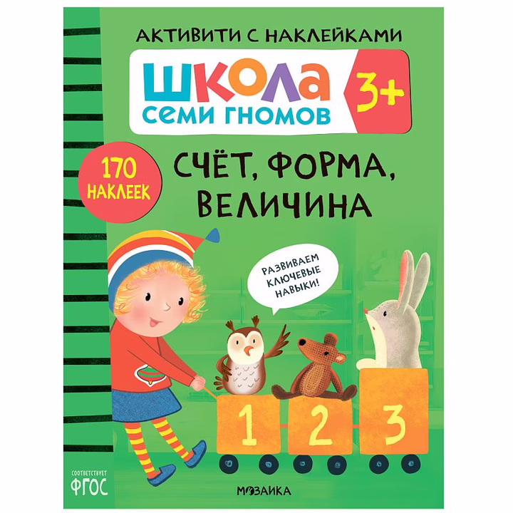 Книга "Счет, форма, величина 3+" из серии "Школа Семи Гномов". Активити с наклейками» предназначена для формирования и развития у детей от 3 до 4 лет элементарных математических представлений, способности измерять величину предметов, определять их форму.