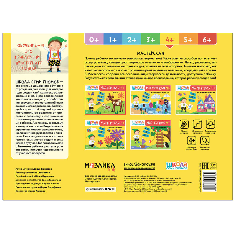 Книга "Лепка 4+" из серии "Школа Семи Гномов. Мастерская" – это красочный альбом для занятий лепкой с ребенком от 4 до 5 лет. Занятия на близкие и понятные ребенку темы расположены по мере усложнения: поступательно переходя от освоения простых навыков к более сложным заданиям, ребенок научится создавать творческую работу на бумаге с помощью пластилина.