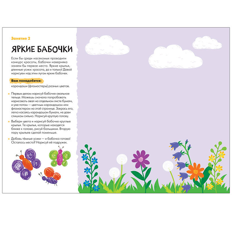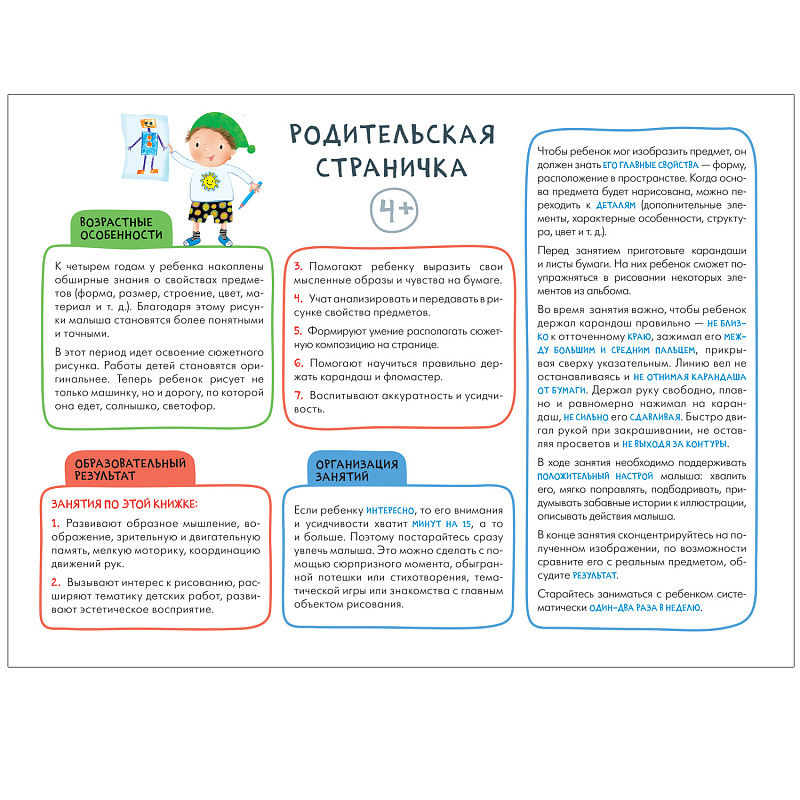 Результатом каждого занятия станет законченное произведение, которое ребенок создал сам. В конце альбома юного художника ждет большое итоговое задание, где он сможет применить все свои новые умения. Подходящий уровень сложности и полученное удовольствие от занятий – вот залог успешного обучения по системе.