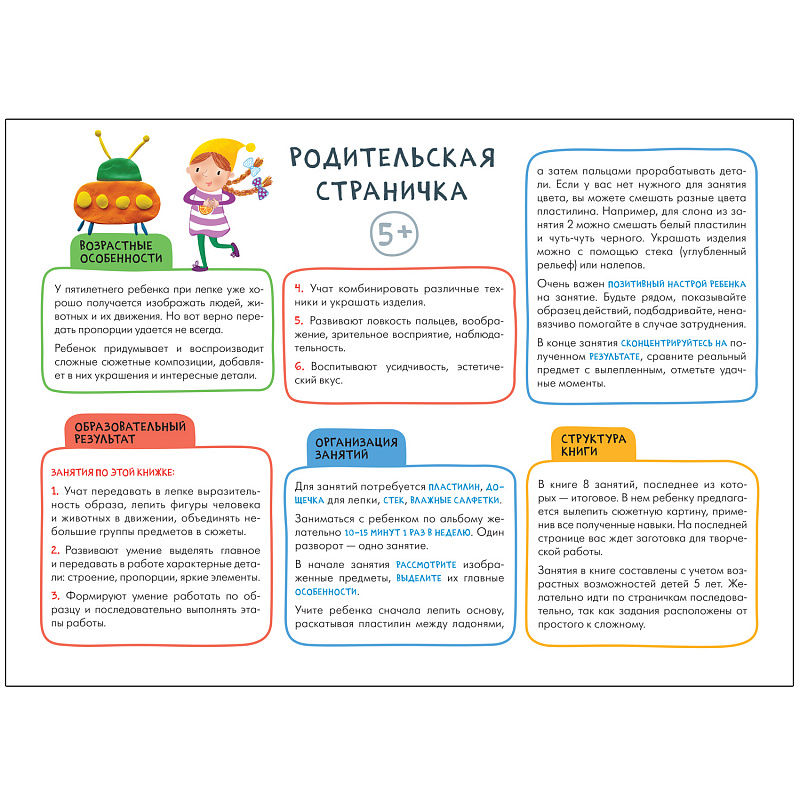 Книга "Лепка 5+" из серии "Школа Семи Гномов. Мастерская" – это красочный альбом для занятий лепкой с ребенком от 5 до 6 лет. Занятия на близкие и понятные ребенку темы расположены по мере усложнения: поступательно переходя от освоения простых навыков к более сложным заданиям, ребенок научится создавать творческую работу на бумаге с помощью пластилина.