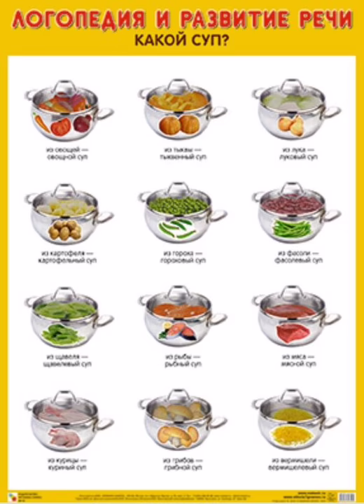 Плакат "Какой суп?" предназначен для логопедических занятий с детьми, а также занятий по развитию речи. Занятия по этому плакату научат детей образовывать и правильно употреблять относительные прилагательные. Кроме того, они способствуют расширению словарного запаса детей, развитию памяти, внимания.