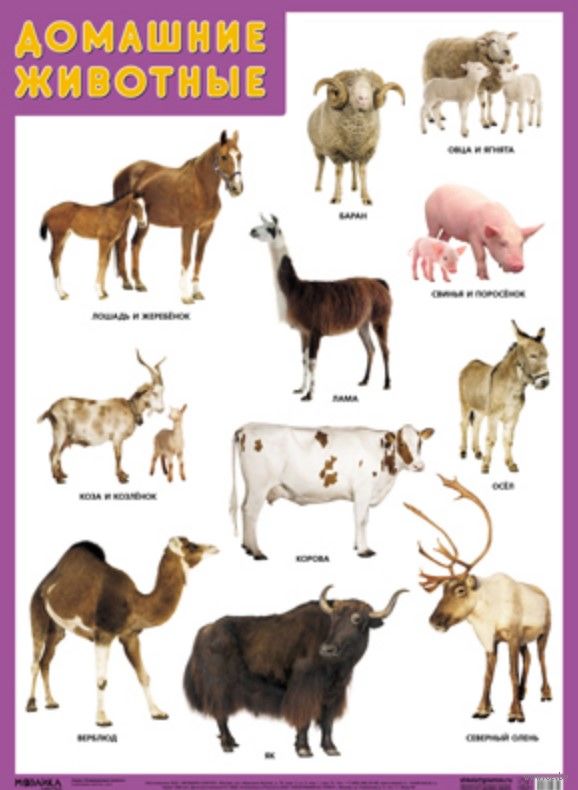 На этом плакате наряду со знакомыми детям домашними животными, такими как: корова, лошадь, овца, представлены верблюд, лама, як и северный олень.