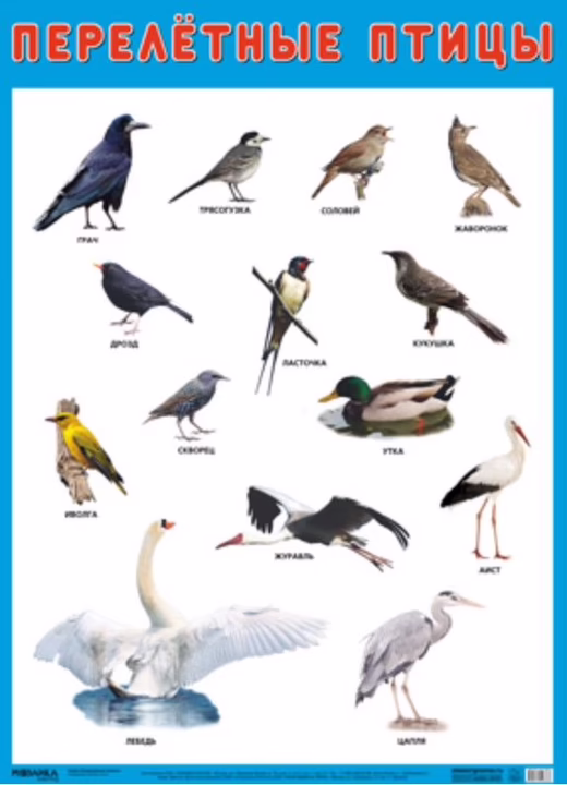 Плакат большого формата "Перелетные птицы" познакомит детей с птицами, которые с наступлением холодов улетают в теплые страны.
