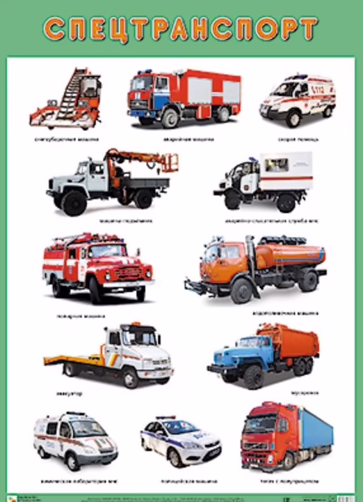 Плакат большого формата "Спецтранспорт" познакомит детей с различными видами специального транспорта: пожарной машиной, скорой помощью, аварийной машиной и другими.