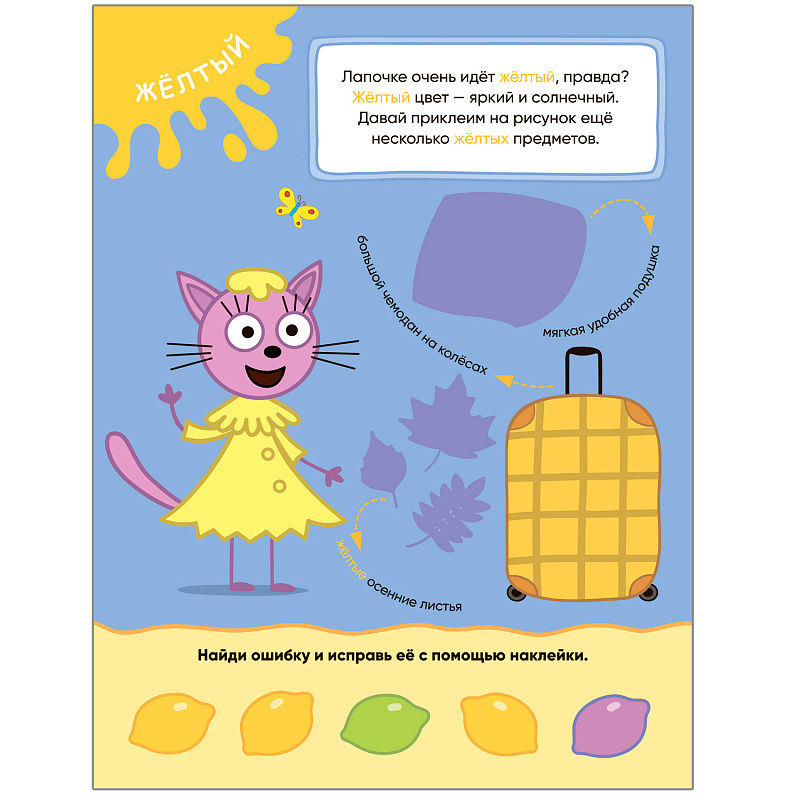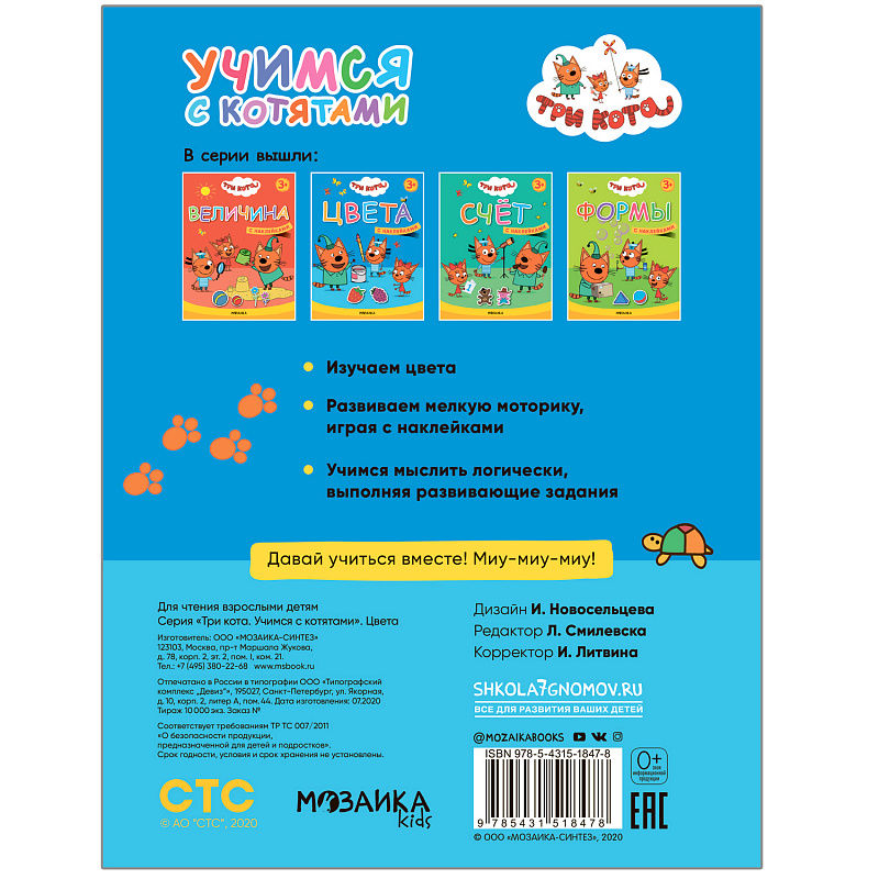 Книга "Цвета" серии "Три кота. Учимся с котятами" – это не только увлекательная книга с наклейками, но и отличный способ закрепить знания, развить мелкую моторику, логику и внимание. Вместе с тремя котятами ребенок познакомится с основными цветами: красным, желтым, зеленым, синим и оранжевым. На каждой странице его ждут задания на изучение того или иного цвета. Внизу страницы – забавные нелепицы, в которых нужно исправить ошибку. А в конце книги – задания для самопроверки. И все это с наклейками.