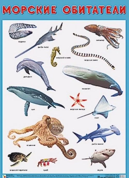 Плакат большого формата "Морские обитатели" познакомит детей с представителями морских глубин: акулой, скатом, кальмаром, осьминогом, морской черепахой и многими другими.
