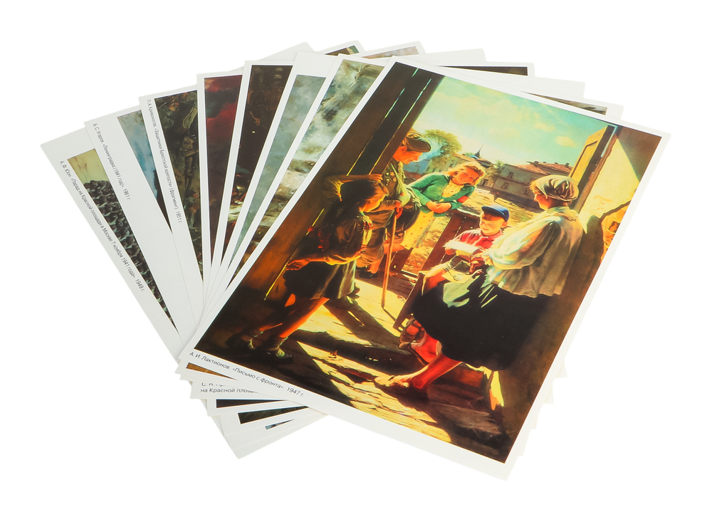 В наборе 8 репродукций известных картин на тему Великой Отечественной войны. У меня, когда смотрю на картины, мурашки по коже. Формат А4, что позволяет рассмотреть детали, окунуться в историю.